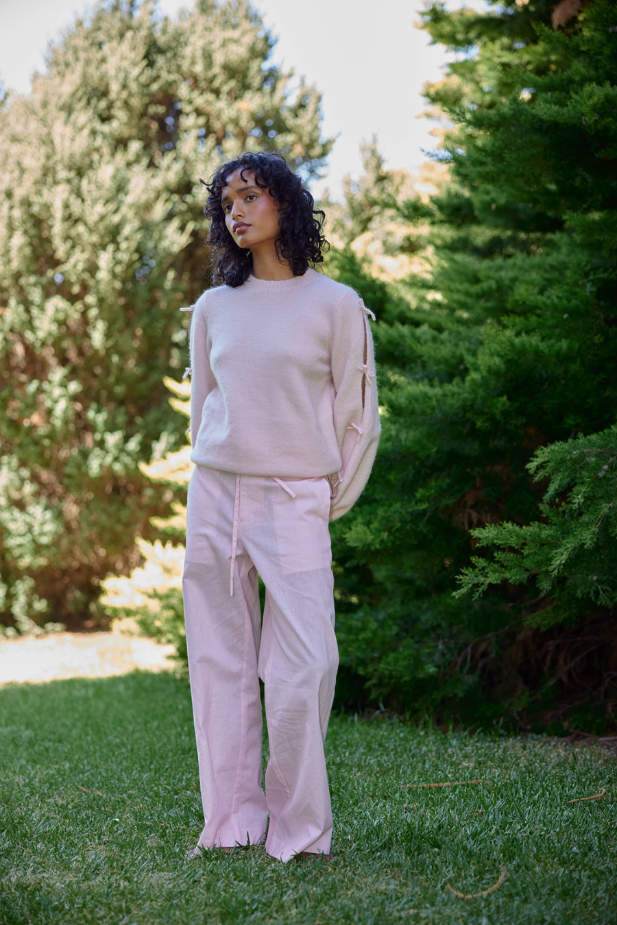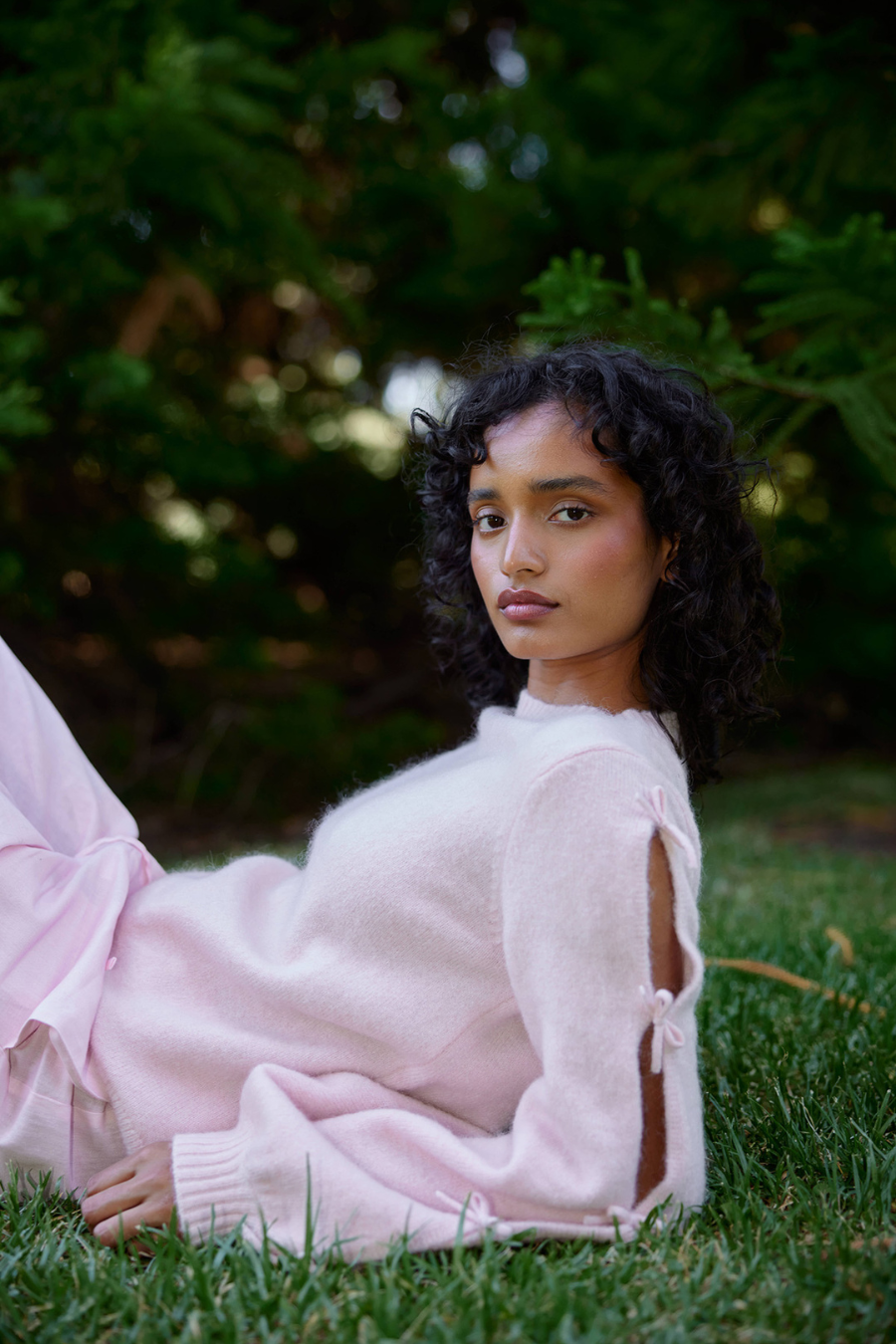 Delicately adorned with bow-tied cutouts along the sleeves, this statement knit is the perfect blend of comfort and sophistication.