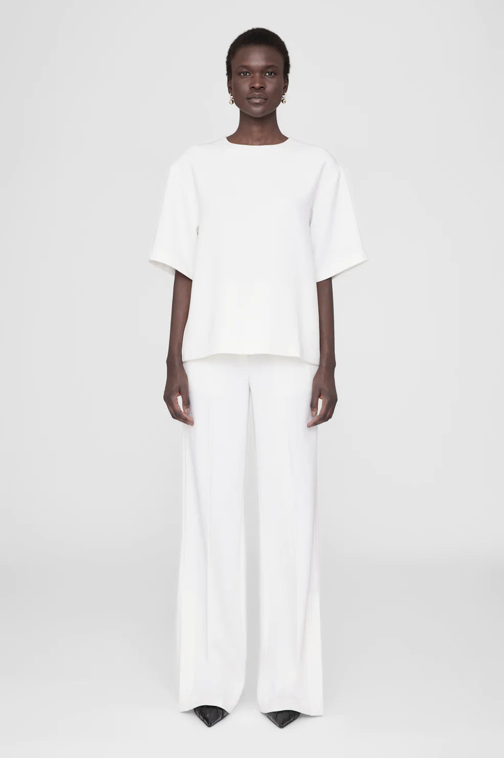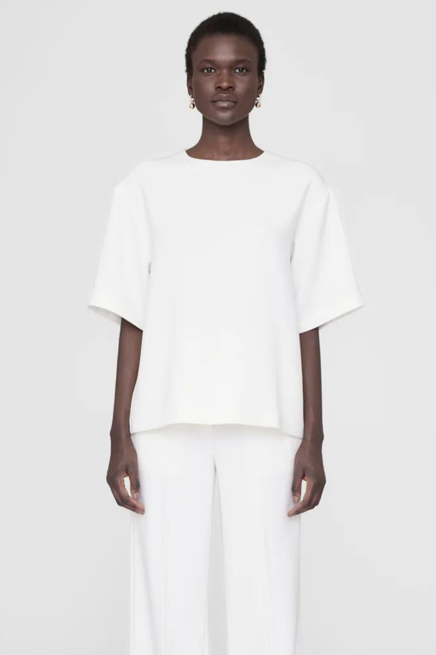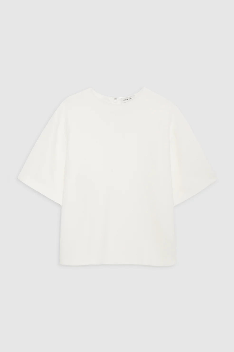 An oversized T-shirt elevated in a soft textured crepe fabrication. This everyday style features a clean crew neckline, wide elbow-length sleeves, and an invisible zipper at the back neck.