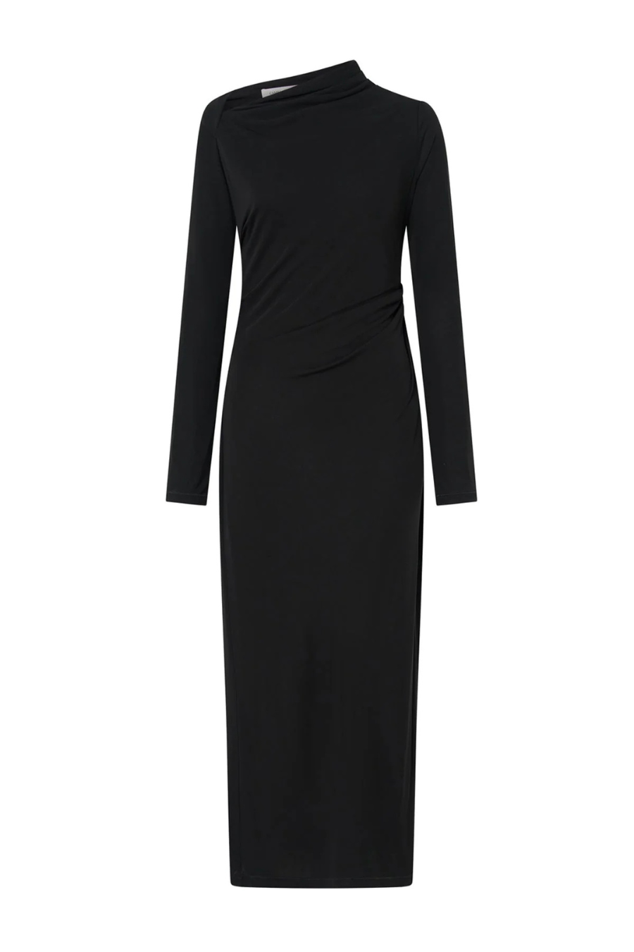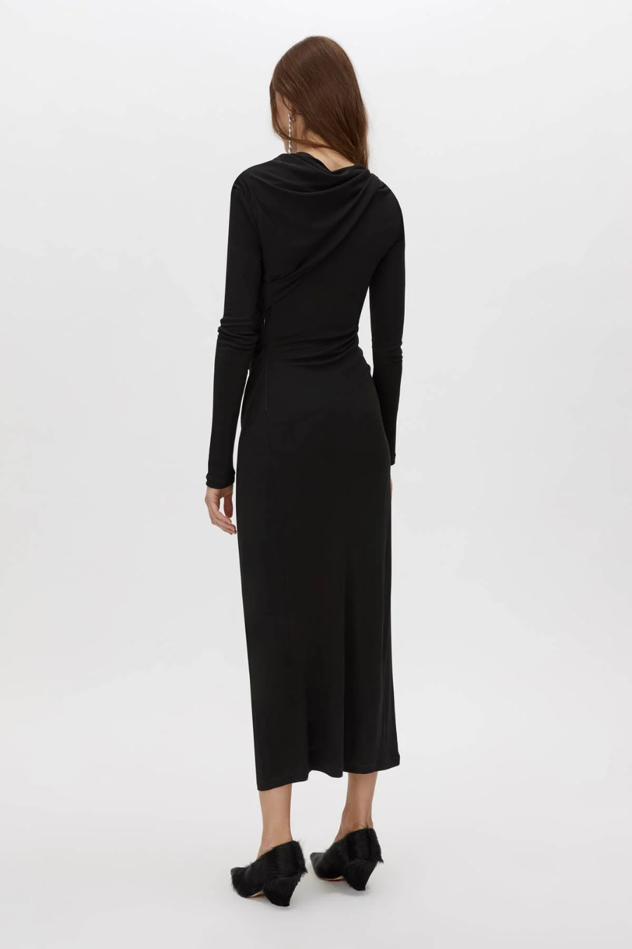 The Mai Long Sleeve Dress features a twisted neckline that adds a unique touch to its sleek design. Crafted for a close fit, it includes tucks along the side seams, creating a flattering silhouette that gracefully contours the body. The mid-length column skirt and side seam invisible zip closure complete the elegant look, while the dress is fully lined for comfort and refinement.