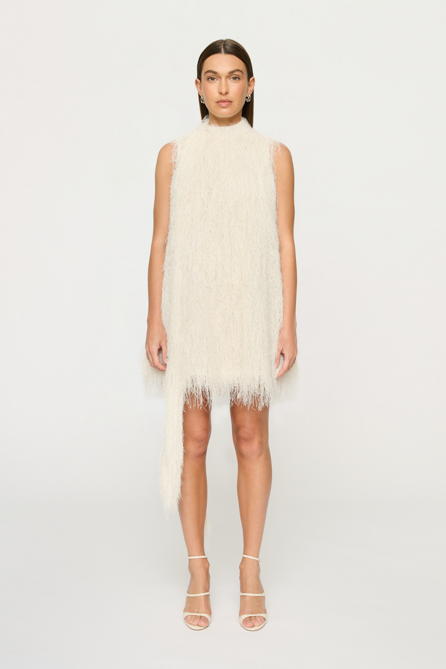The Mara Fringe Mini Dress is a sleeveless mini with high collar which extends to a longline tie which can be bowed or tied.