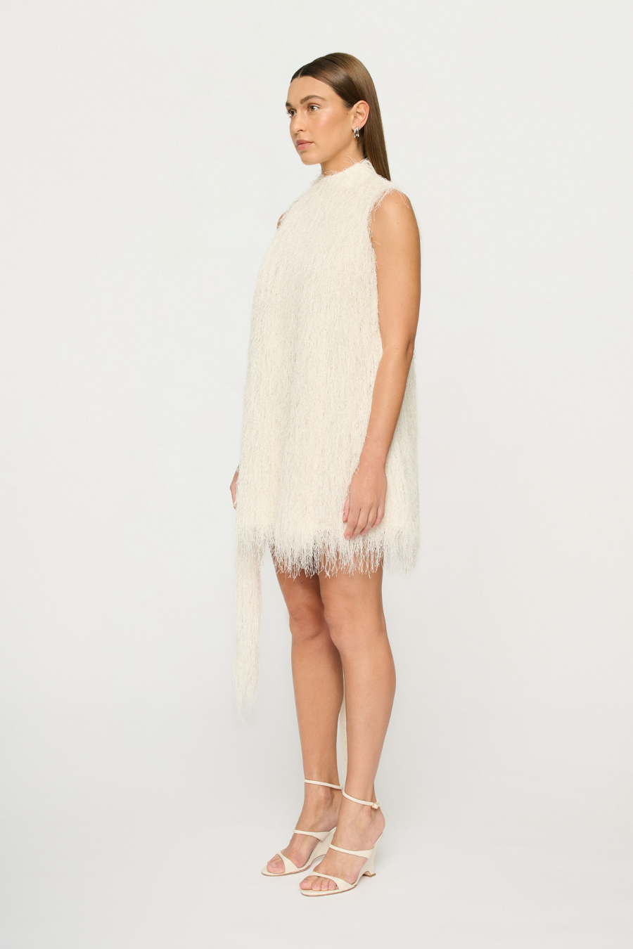 This elevated mini features an open back keyhole and is made in an incredible fringe fabric which drapes and creates effortless movement.