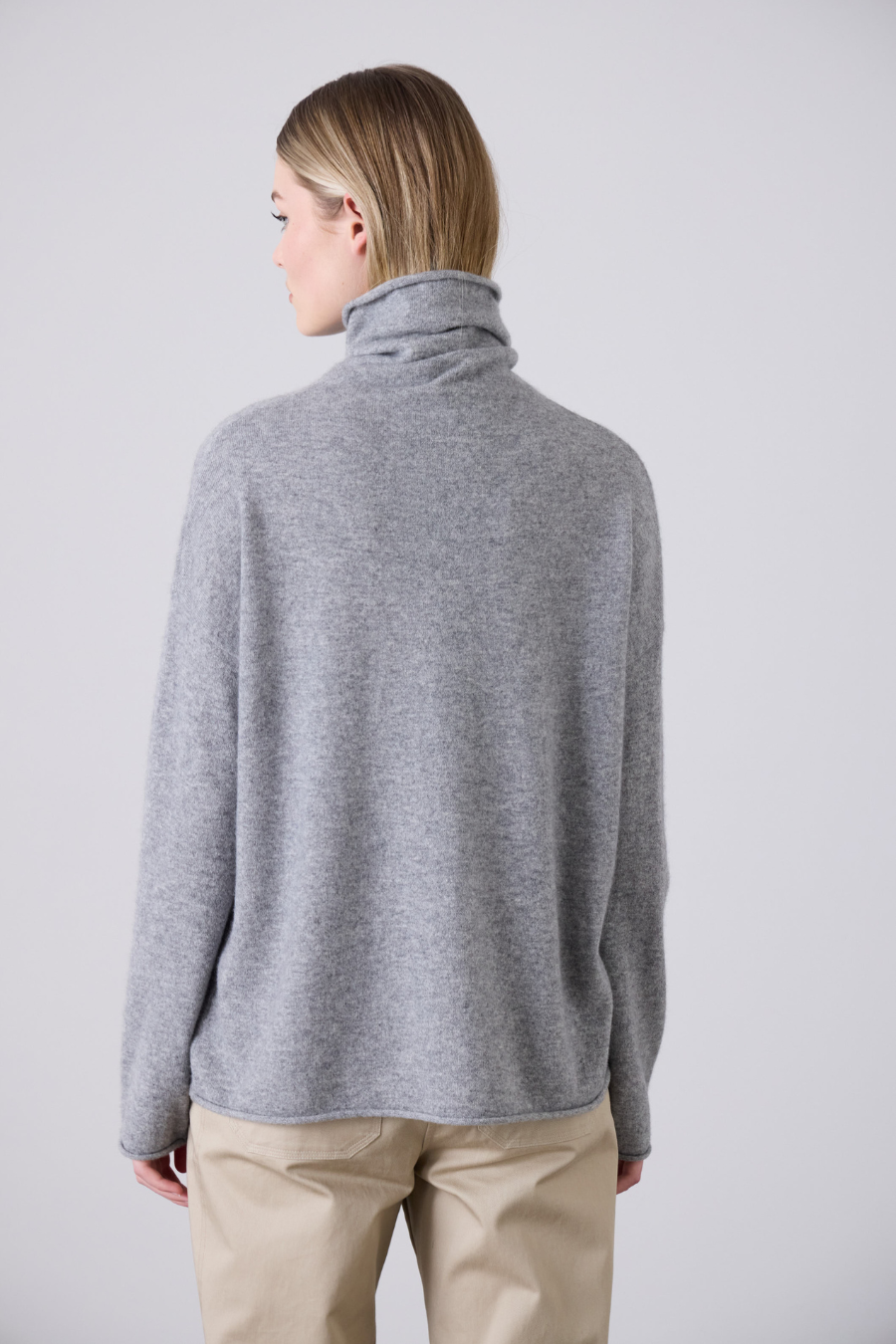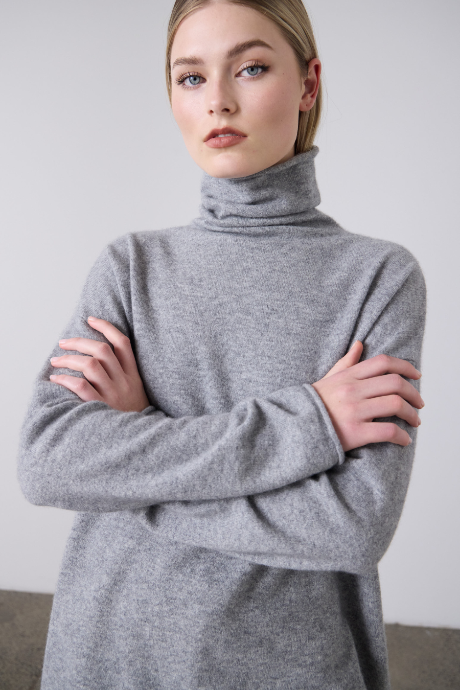 Made from supersoft, pure cashmere, it has simply rolled hems at the cuffs, hem and neck a long funnel neck that can be rolled, folded or left slouchy and a dropped shoulder.