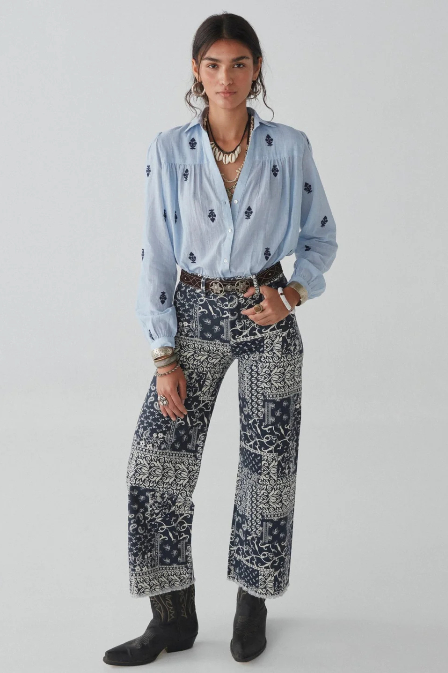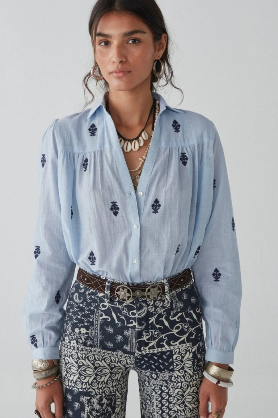 Cut from the softest cotton, this piece dances between the realms of delicate and daring. The light blue fabric is adorned with meticulously embroidered midnight blue floral motifs, each one an ode to subtle defiance.