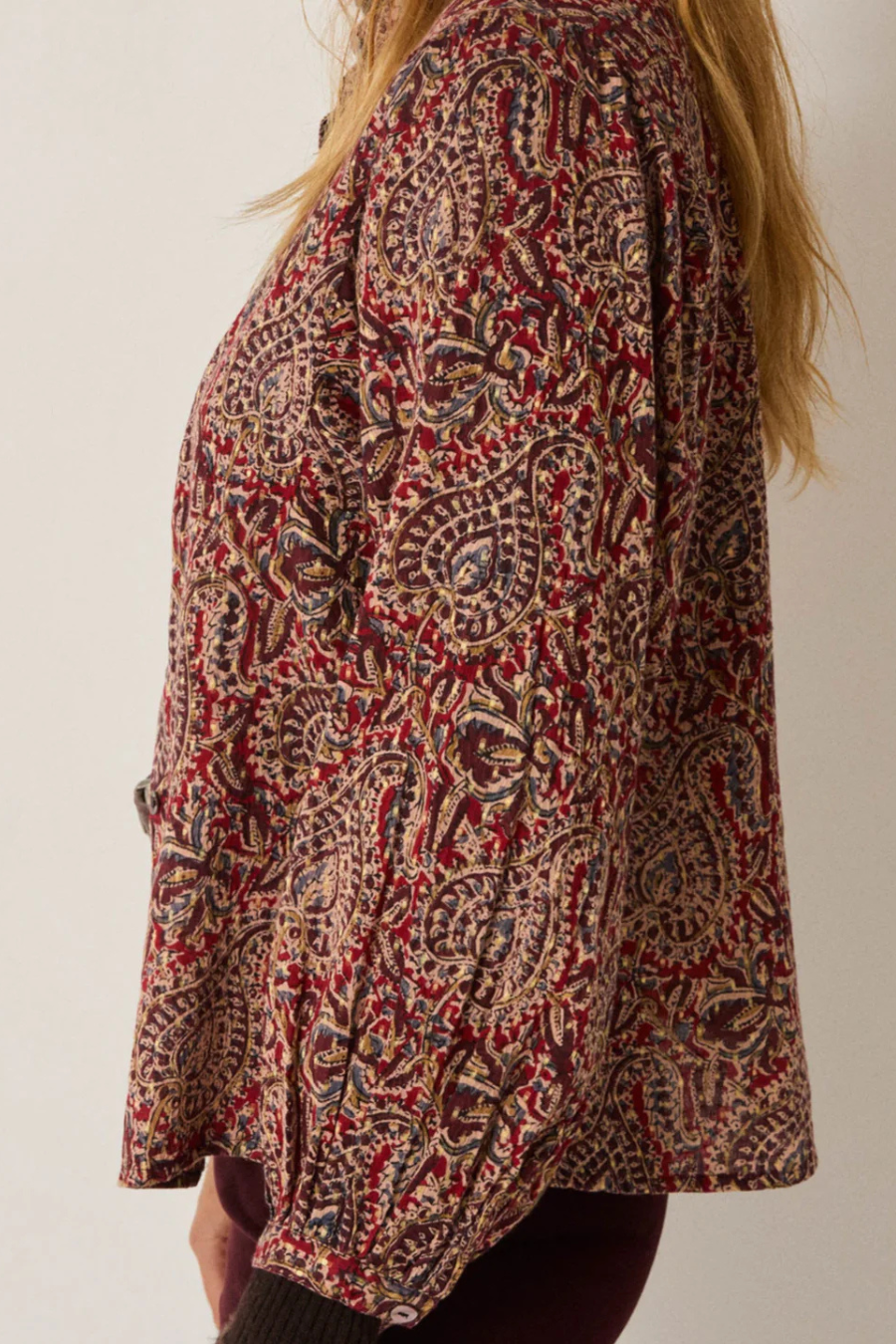 Cut in viscose, the Marilyn Jacket blouse the Johnny print — intricate paisleys and florals in shades of red, blue and sand, arranged in dense medallion repeats. The surface is rich with detail, the colors softened by the drape of the fabric.