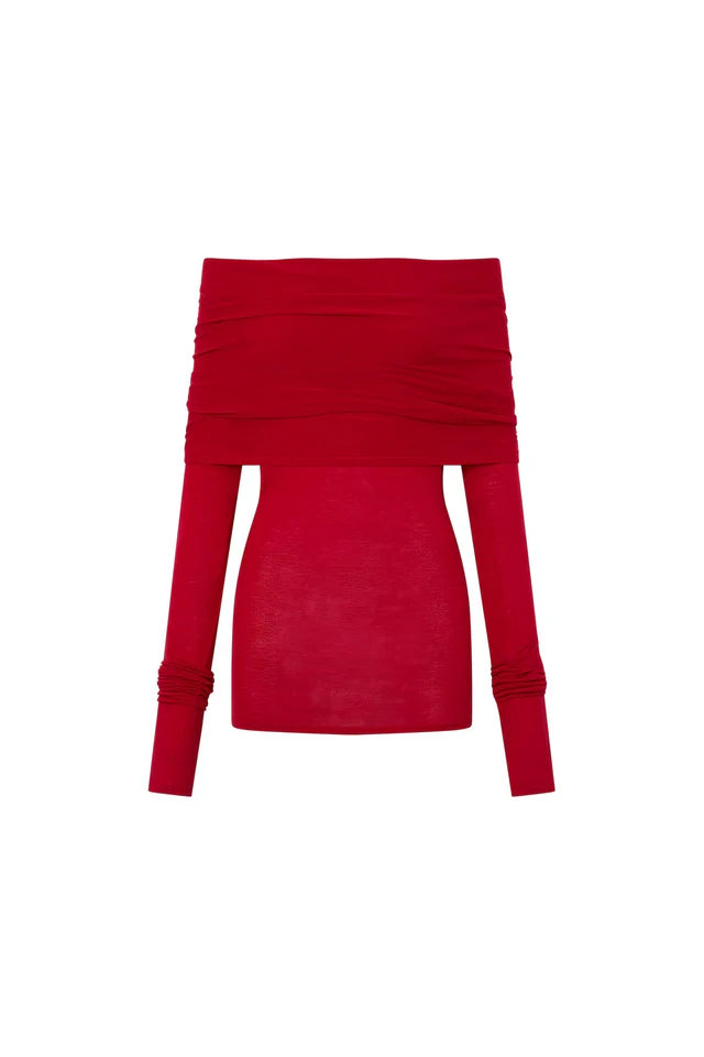 The Marjorie Top is crafted from a Tencel and wool blend in an off-the-shoulder gathered silhouette. This top features a semi-sheer fabrication and narrow twin needle hems.