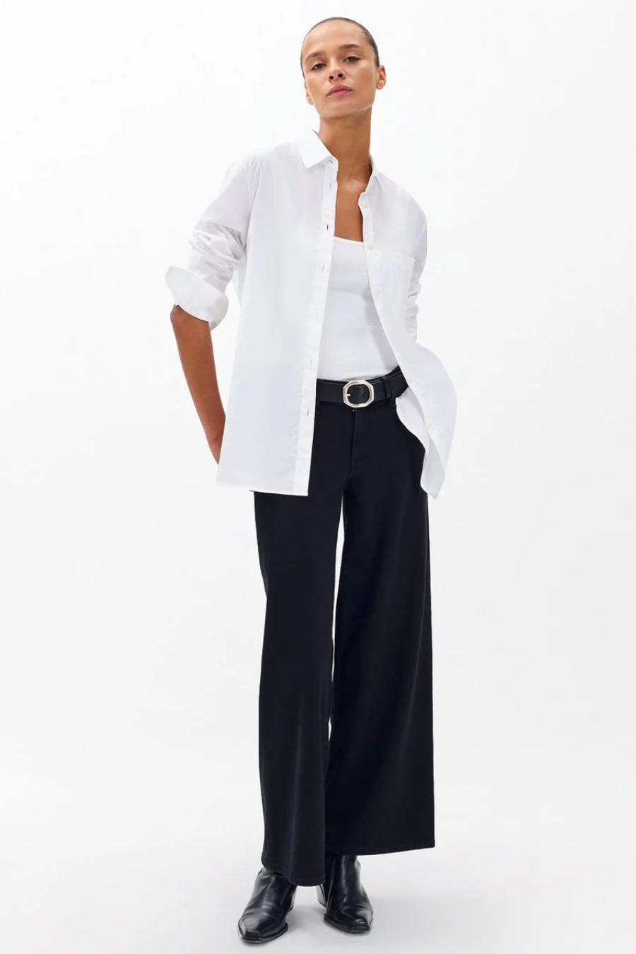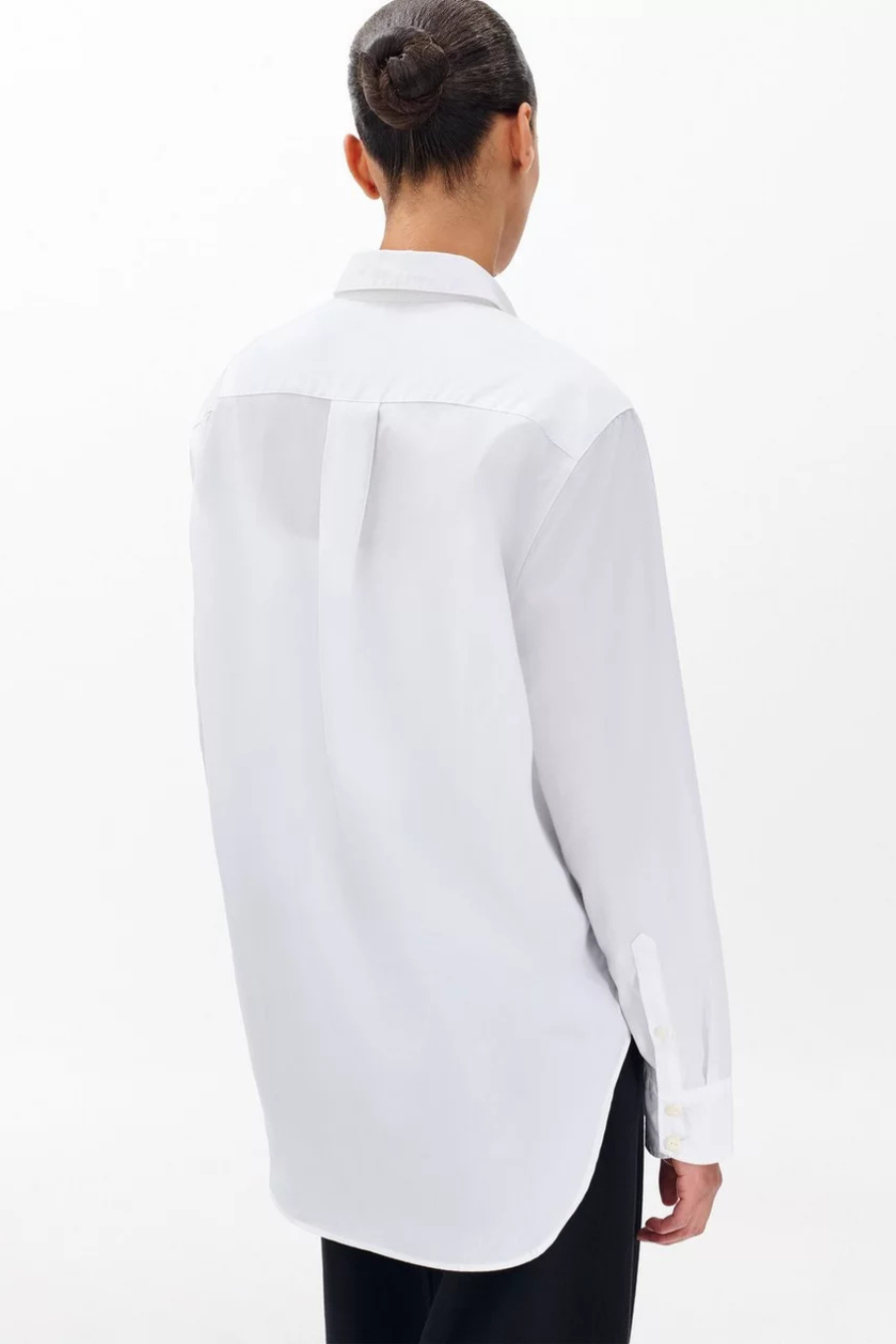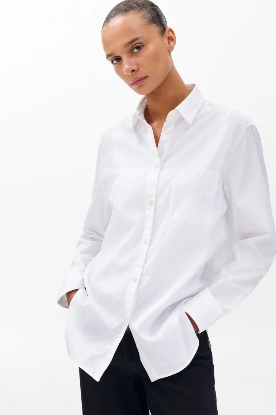 Tailored to perfection with feminine detailing at the cuff and a mitered pocket detail, the Maxine Button Down Shirt is timeless, especially when paired over any of our straight leg denim. Updated for summer in a cotton poplin, the Maxine is our most iconic button down silhouette, featuring our signature horn buttons, a box pleat at the center back, and a high-low hem. It's a wardrobe must-have that will be a forever favorite.