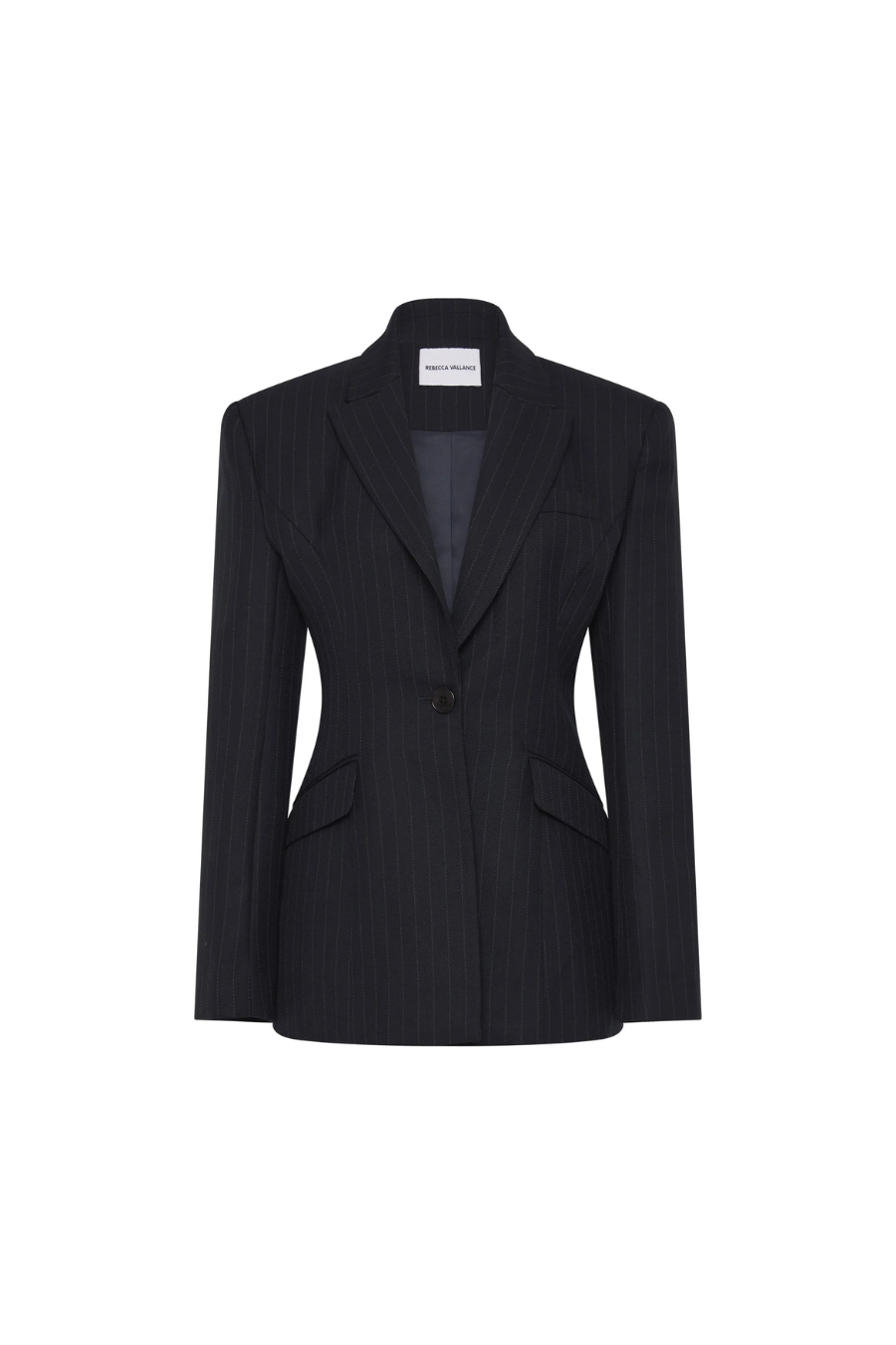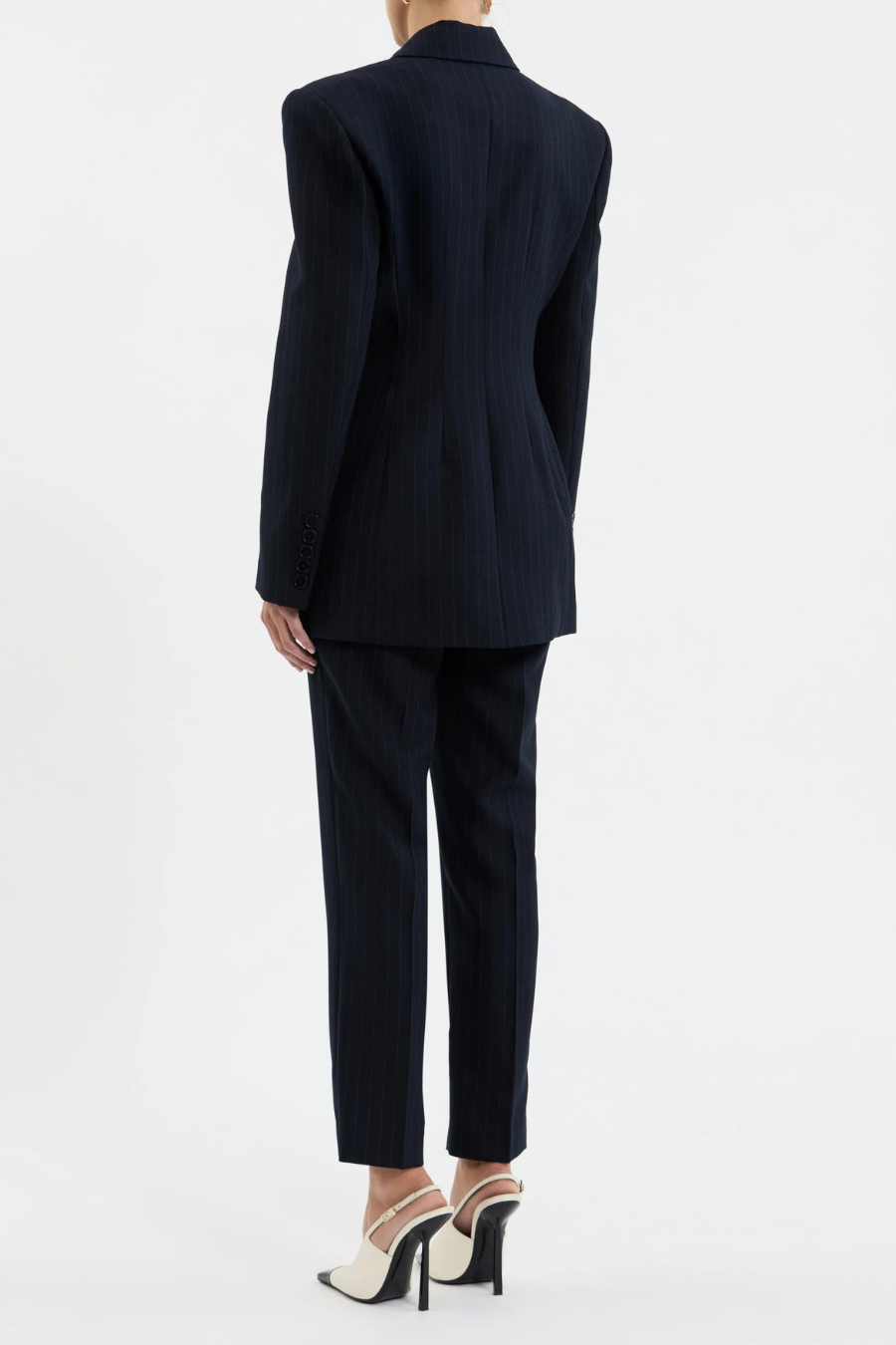The Maxwell Blazer is effortlessly sophisticated, tailored from a navy pinstripe print. Its single-breasted design and structured lapel create a polished look, further elevated by a fitted waist and shoulder pads that enhance the sleek silhouette. Front flap pockets, an angled welt pocket, and a back vent provide ease of wear, whilst button details offer a refined finish. Complete with lining, this blazer is a versatile styling essential to add to your wardrobe and pairs seamlessly with our Maxwell Pant.