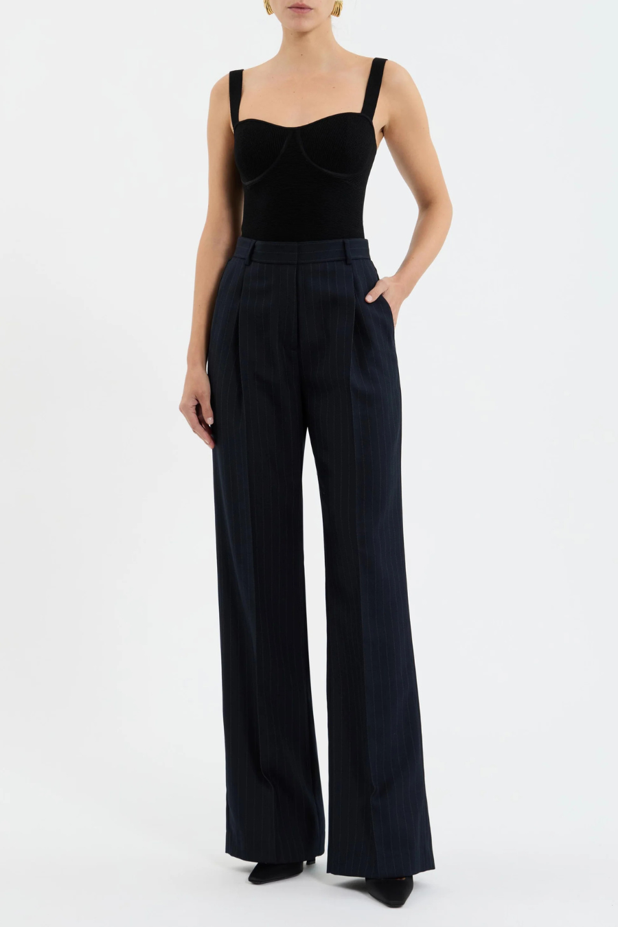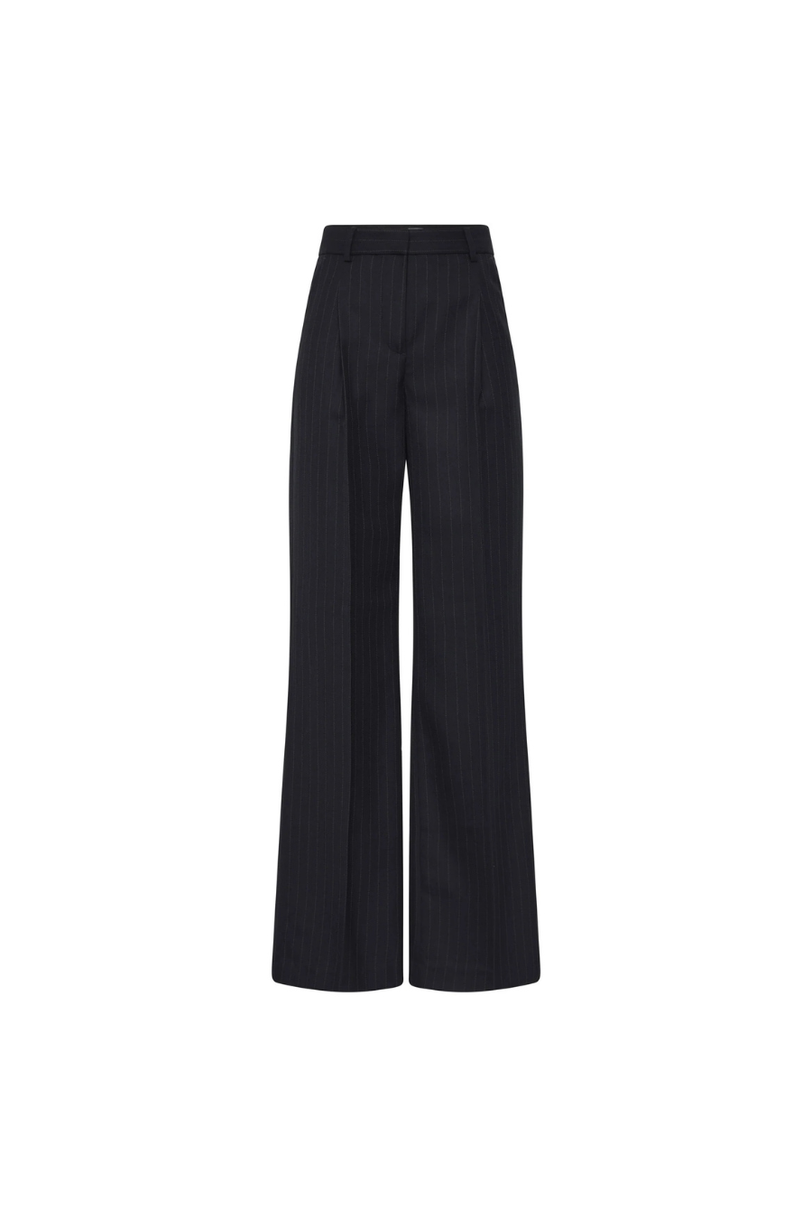 The Maxwell Pant infuses timeless sophistication with effortless style in a navy pinstripe design. Its tailored wide leg fit and high waisted silhouette offer a flattering shape, enhanced by pressed creases and inverted front pleats. Side seam pockets and belt loops ensure effortless wear, while lining and a front fly zip fastening provide added comfort and ease. Polished and refined, these pants pair perfectly with your wardrobe essentials or our Maxwell Crop Blazer.