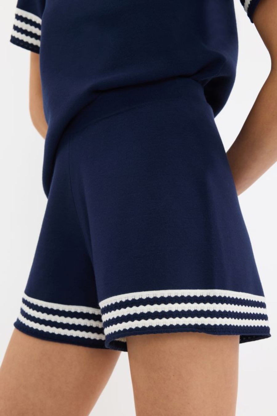 The Mayflower Short in navy strikes the perfect balance between comfort and chic style. Crafted from fine-knit Milano, its relaxed silhouette is defined by a ribbed elastic waistband for effortless wear. A contrasting chevron hem adds a refined touch, while its versatile design pairs seamlessly with our matching Mayflower Top.