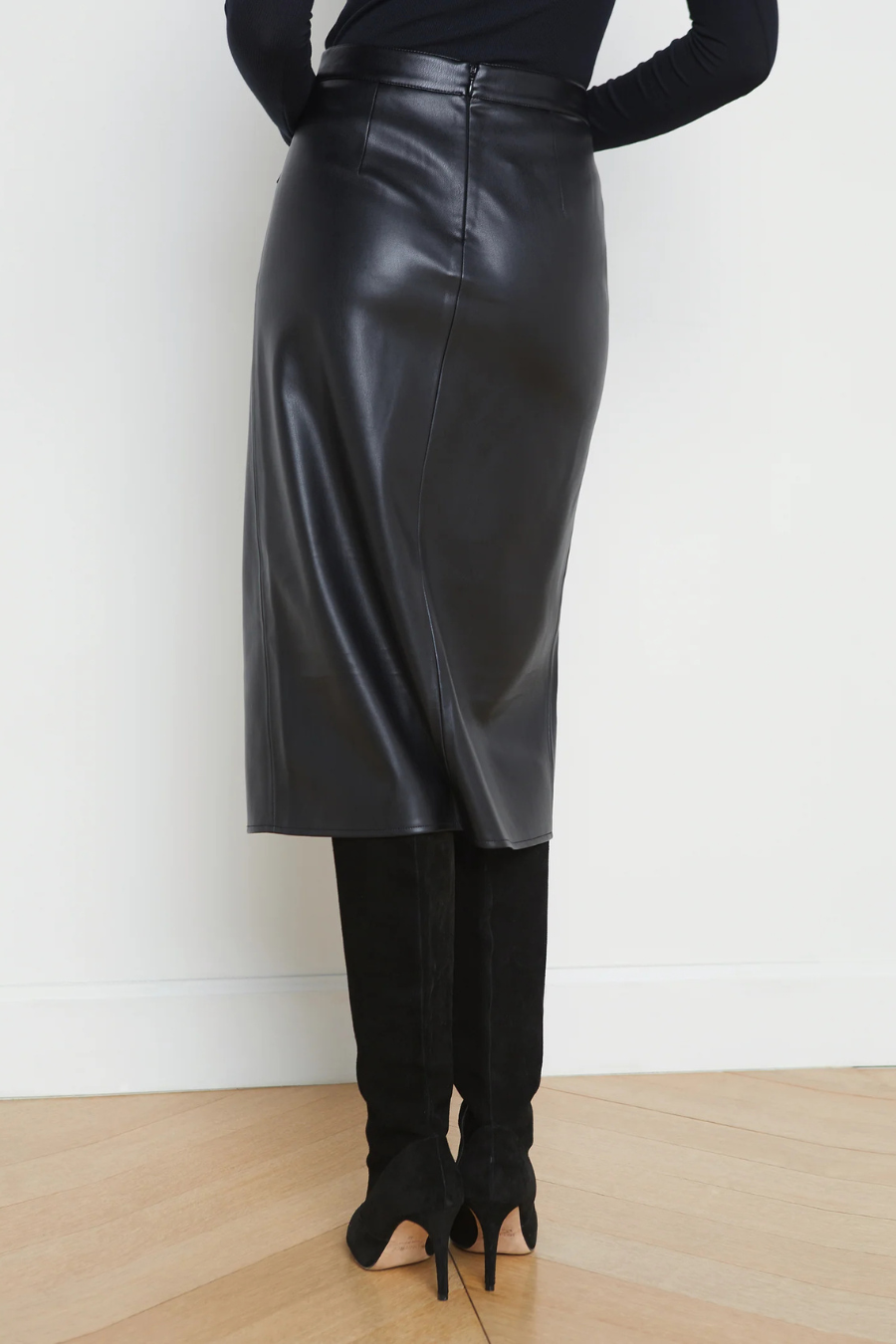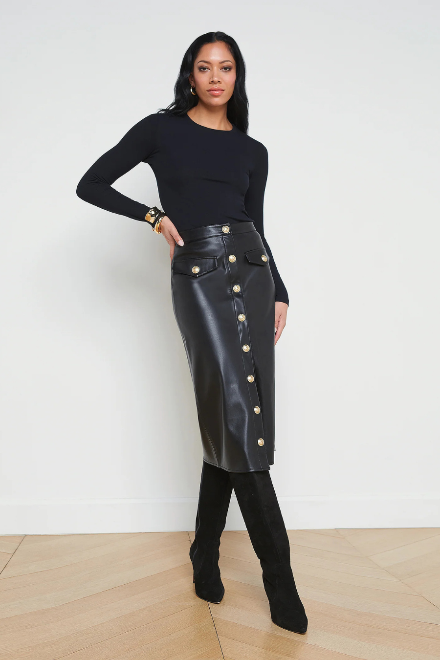 A sleek silhouette and luxe gold accent buttons define our Milann vegan leather skirt. The pencil skirt silhouette hugs the waist before draping straight to the midi hem. The embossed-dome button convert to functional snaps at the hem, letting you create a front-slit look. Wear with a minimalist top and pointed-toe boot to let the skirt take center stage.