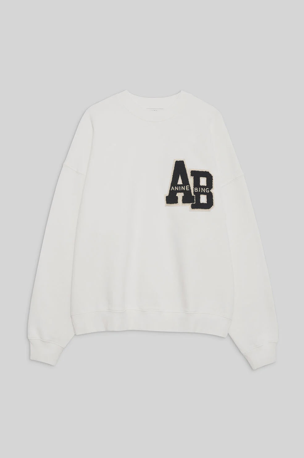 The Miles Oversized Sweatshirt Letterman is an oversized crewneck pullover made from midweight 100% organic cotton fleece in off white. This relaxed casual features a custom ANINE BING letterman chenille patch graphic at the chest in black and cream.