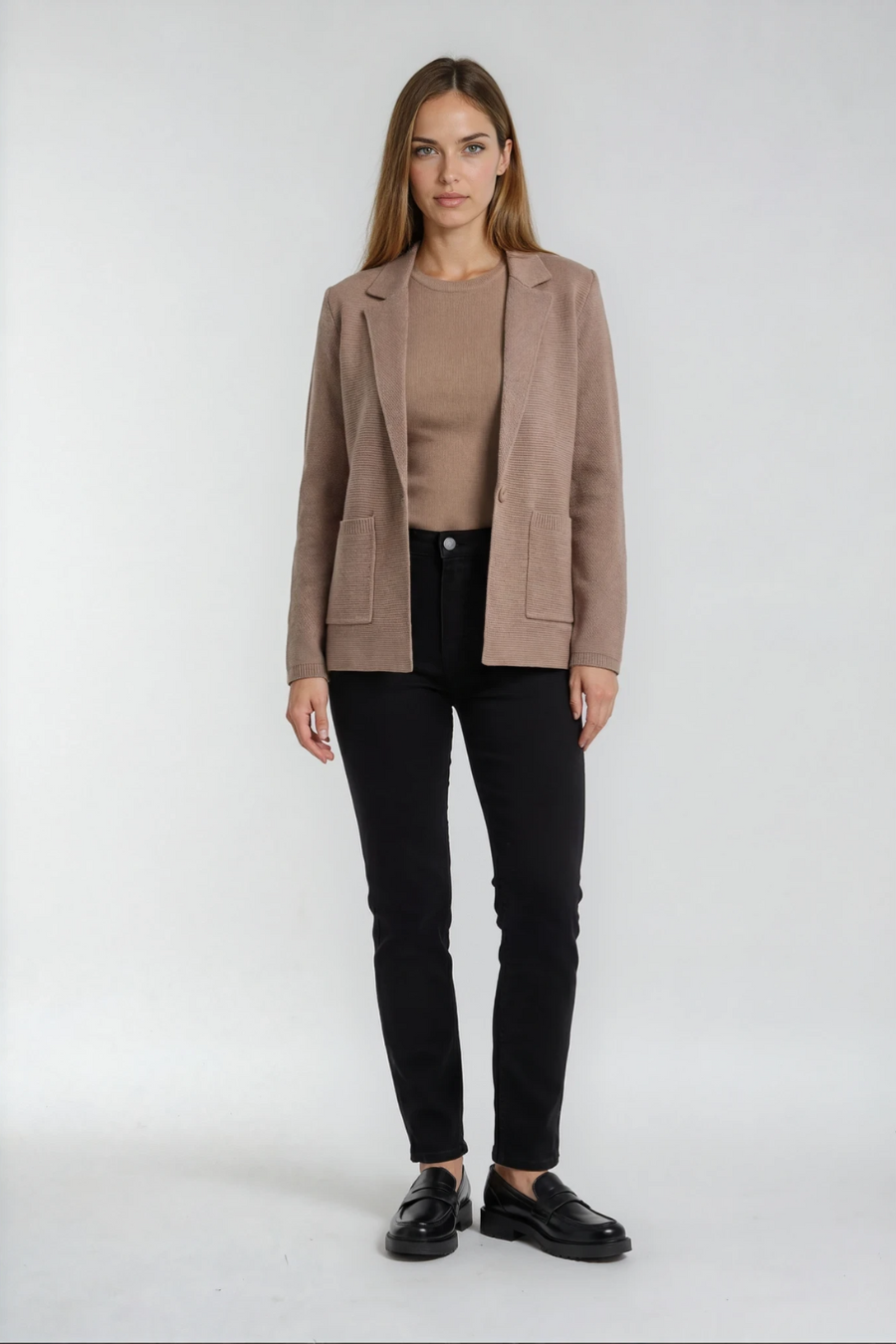 A premium knit single-breasted blazer. Tapered at the waist with sleek lapels and patch pockets, finished with dome buttons embossed with an anchor motif.