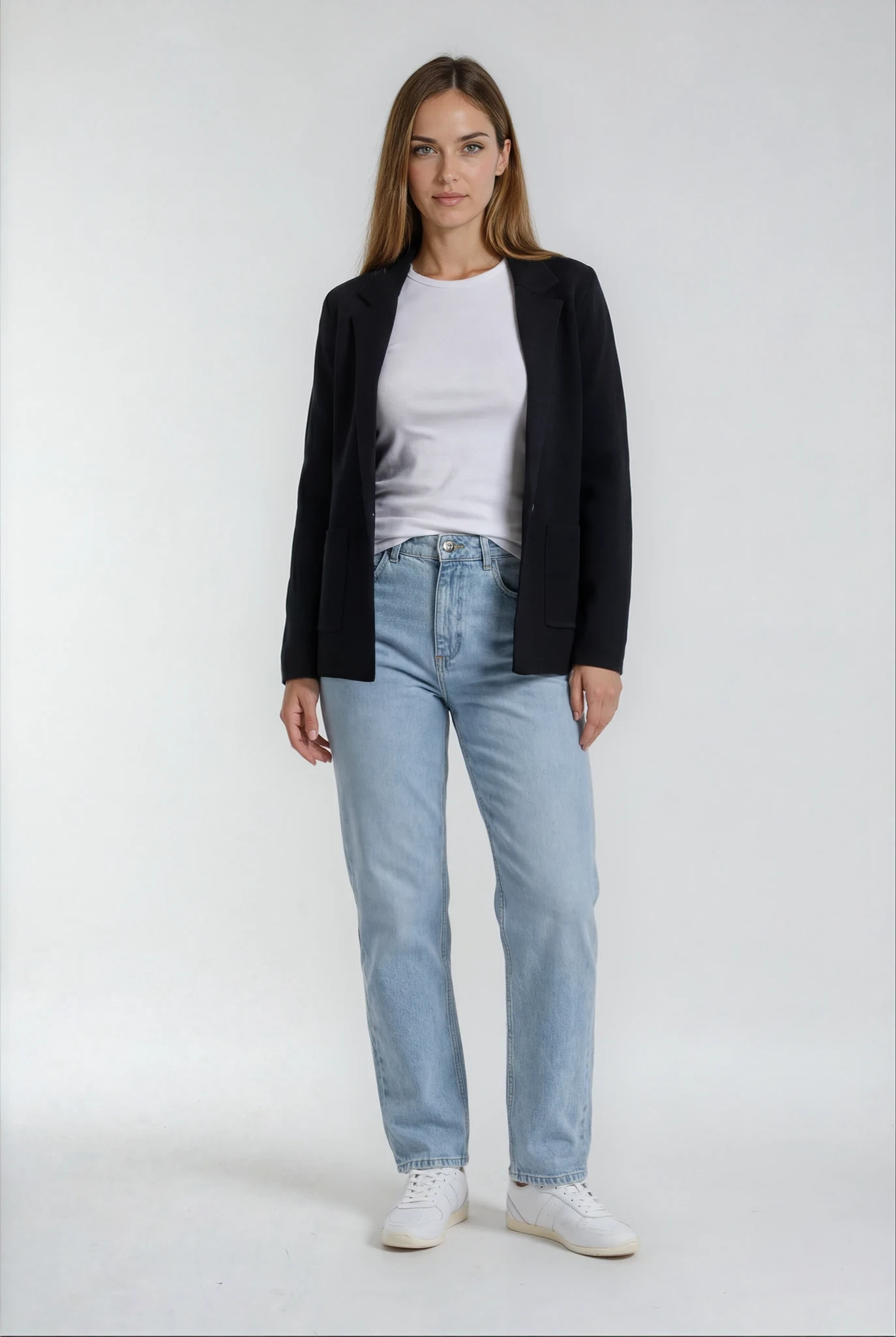 A premium knit single-breasted blazer. Tapered at the waist with sleek lapels and patch pockets, finished with dome buttons embossed with an anchor motif.