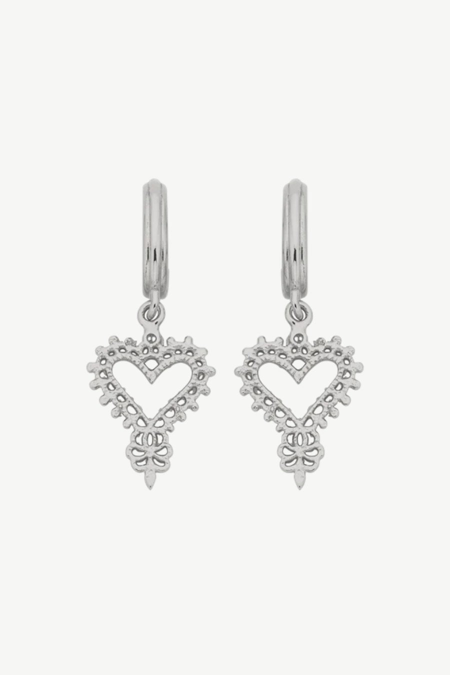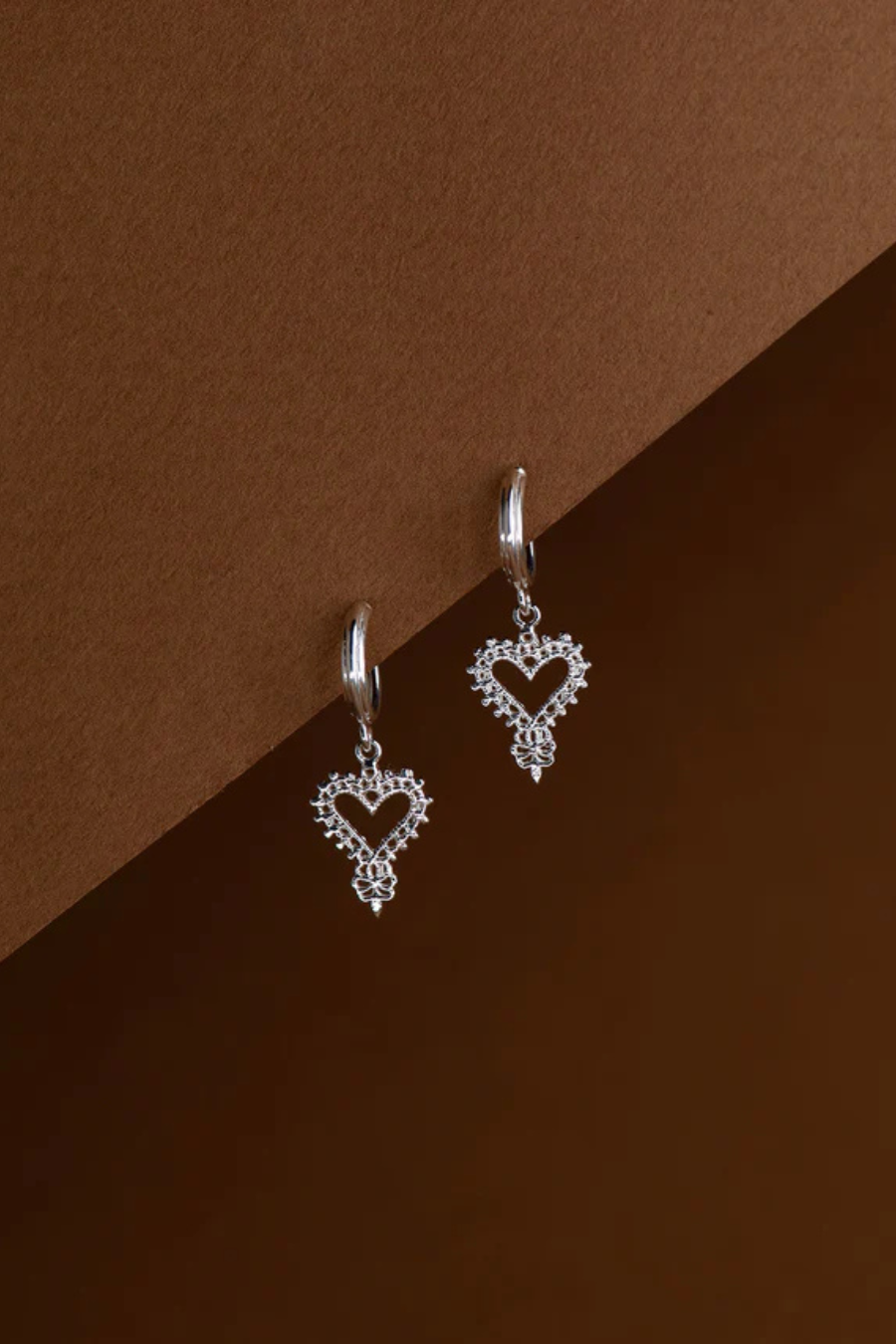 These silver earrings feature a miniature heart pendant, gracefully suspended from a beautifully textured hoop. They gently sway, capturing the essence of bohemian grace and timeless romance.