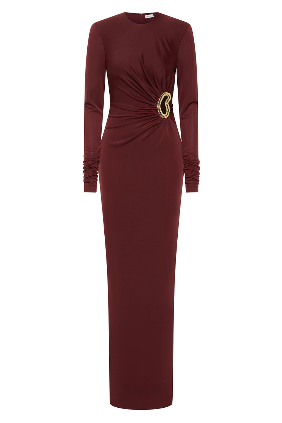 The Mischa Maxi Dress is crafted from Jersey fabric and showcases side cutouts accented with uniquely shaped gold hardware. It includes long sleeves with gathered cuffs and a discreet back zipper.