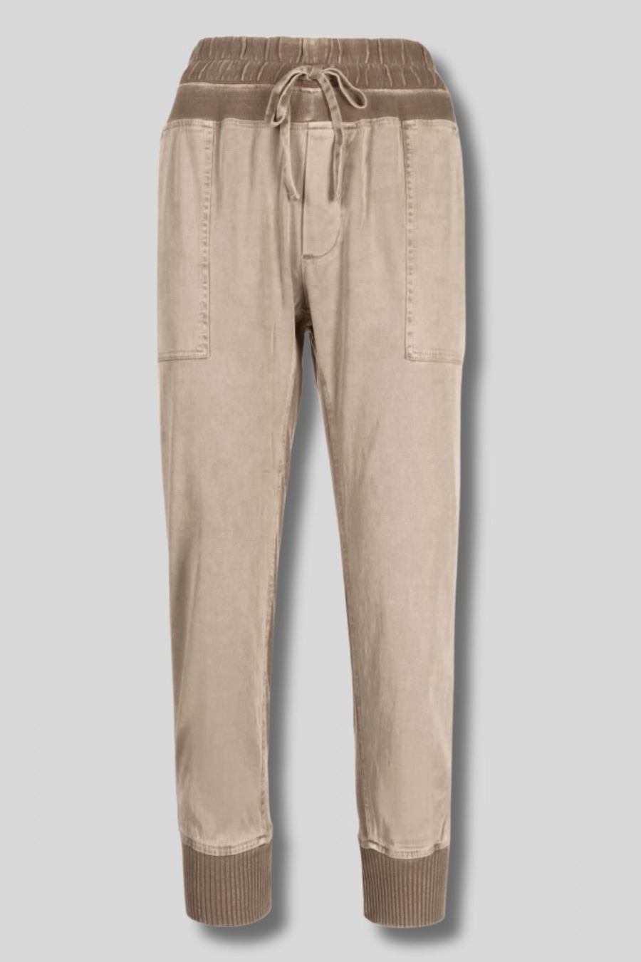 Contrast Cotton mixed media jersey pant. Constructed with lightweight Cotton-Rayon Stretch Garbardine (GCS) and Vintage Jersey (HVJ) panels along the out seam, inseams, and waistband. Pull-on elasticated waistband with external drawcord. Front slash patch pockets. Back patch pockets with flap and button closures. Ribbed knit cotton cuffs on bottom hems. Gusset detail along inseam.