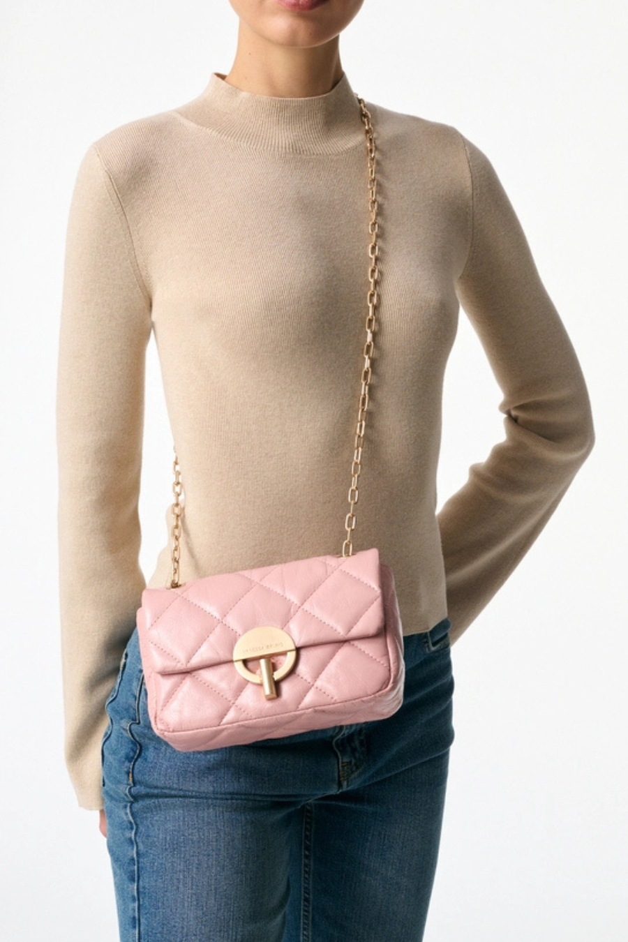 This handbag perfectly combines refinement and functionality thanks to its elegant design. Crafted from cracked and quilted cowhide leather, it captivates with its sophisticated texture and harmonious lines. The perfectly organized interior offers a main compartment and a patch pocket to organize your essentials in style. The iconic round clasp and chain shoulder strap add a touch of modernity and femininity. With its timeless look and functional details, it is a must-have accessory for all your outfits.