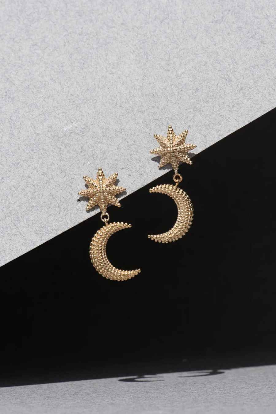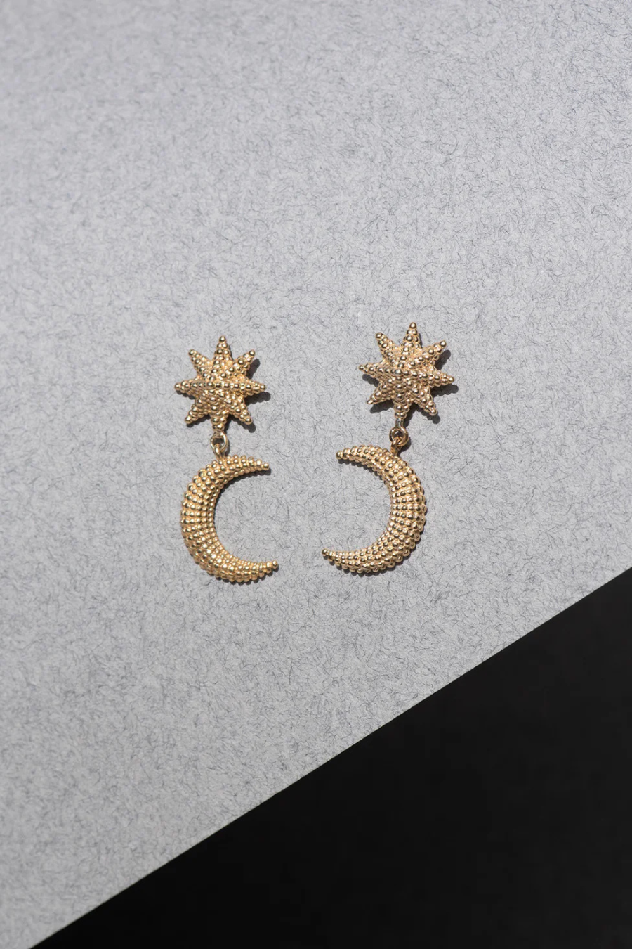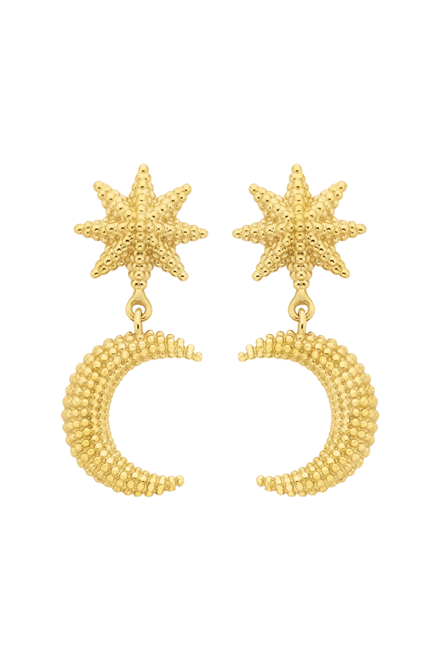 The Moonlight Earrings feature a textured eight-pointed star, symbolising purity, strength, and protection. Beneath it, the Moon, an embodiment of the divine feminine, casts its radiant glow.