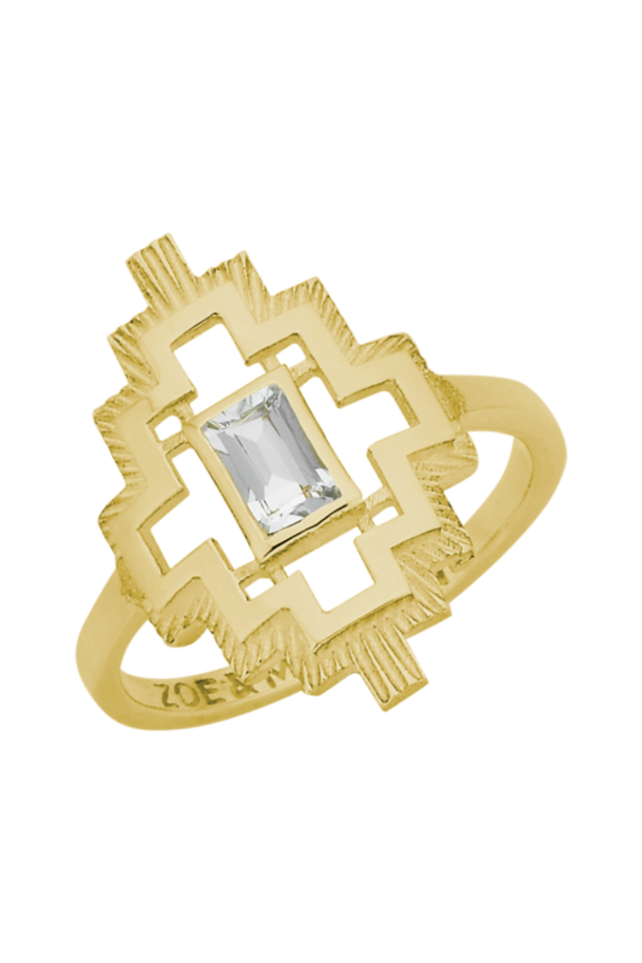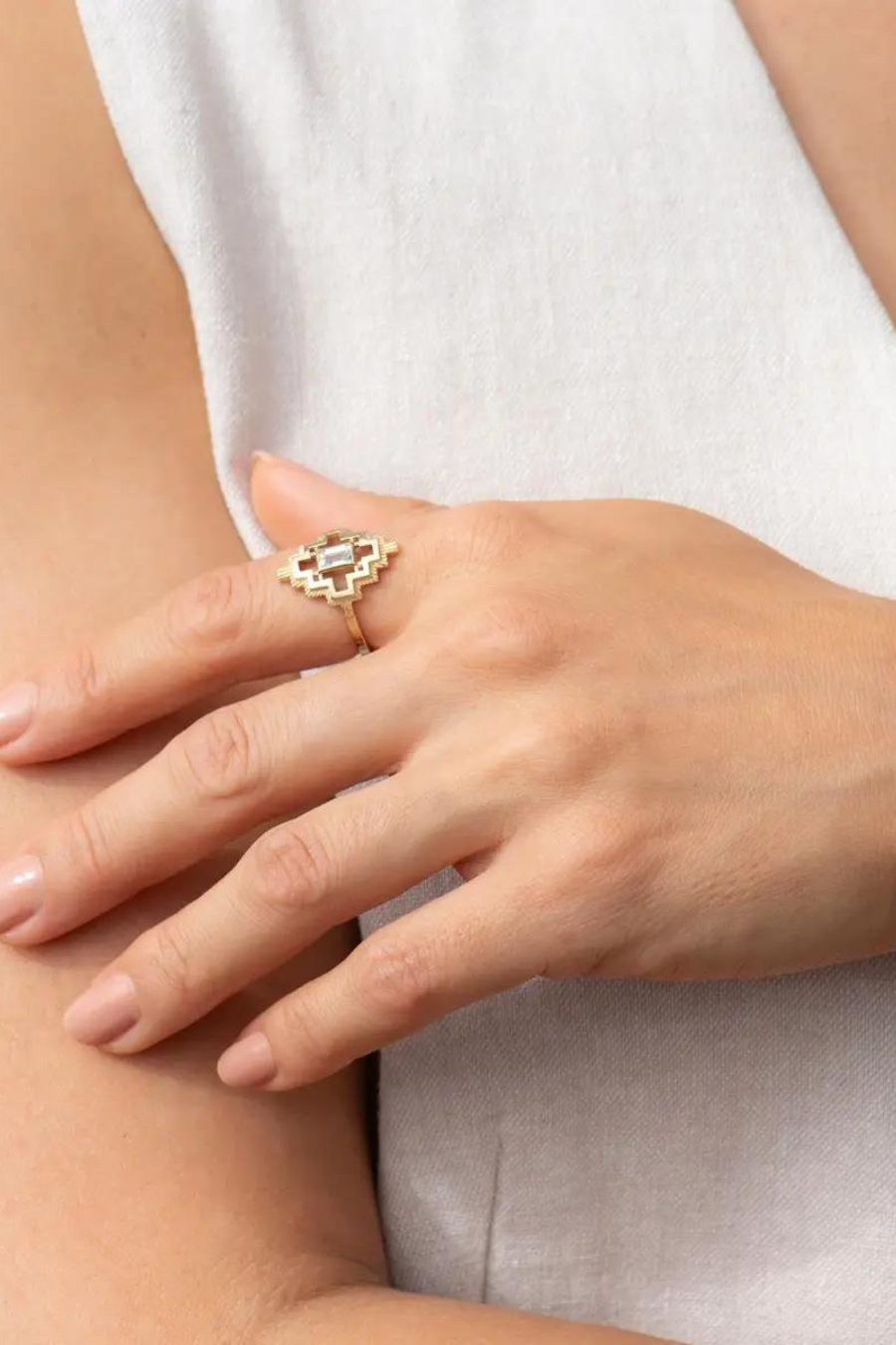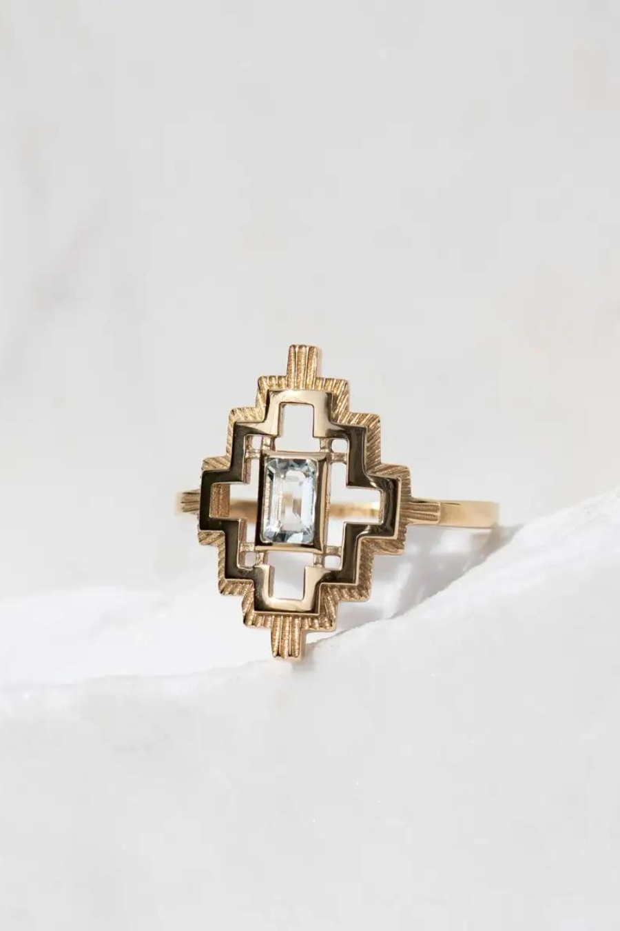 The geometric detail of the Munay Ring accentuates the emerald cut Aquamarine at its centre, captivating your gaze as it gracefully moves with every gesture. With its powerful presence and symbolic meaning, the Munay Ring embodies the essence of love and self-expression, inviting you to embrace your true essence with every wear.