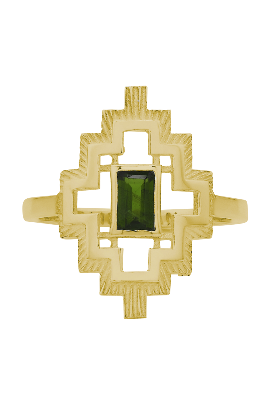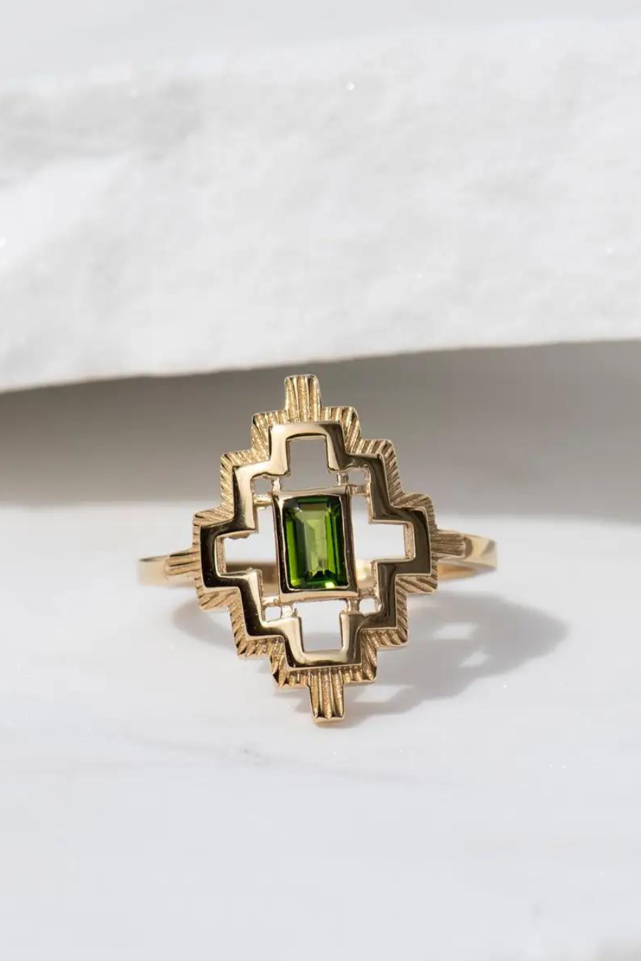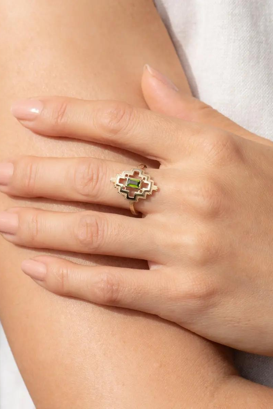 The geometric detail of the Munay Ring accentuates the emerald-cut Chrome Diopside at its centre, captivating your gaze as it gracefully moves with every gesture. With its powerful presence and symbolic meaning, the Munay Ring embodies the essence of love and self-expression, inviting you to embrace your true essence with every wear.
