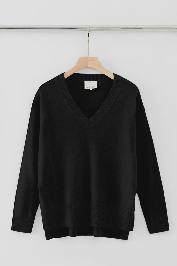 Long-line oversized V-Neck in superior ultra-soft cashmere with contrast thickness ribbed neck trim.