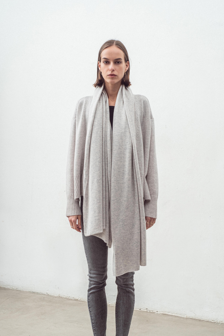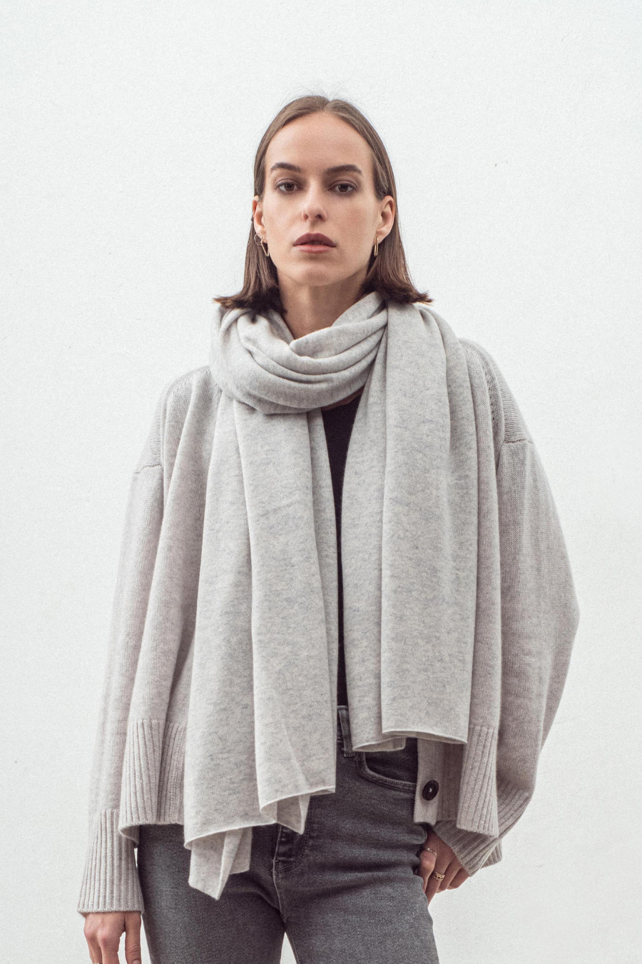 The luxuriously large cashmere travel wrap can be styled to create a range of statement looks