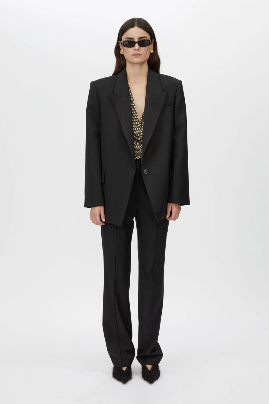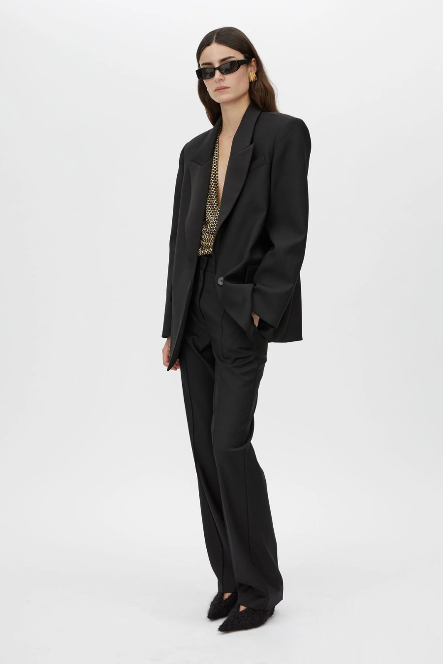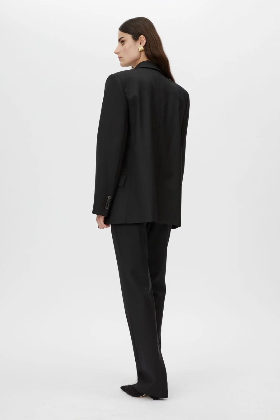 The Natalini Blazer is crafted with luxurious Australian Wool, offering a timeless design with satin lapels and forward-rolling shoulder seams for a refined look. It features two flap pockets, a concealed button closure, and four specialty kissing buttons on the back sleeves, combining modern style with practicality. The raised back hem with a swinging design adds precision and elegance, making this blazer a versatile addition to any wardrobe.