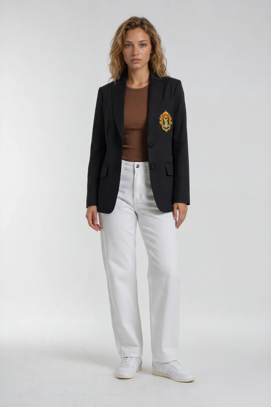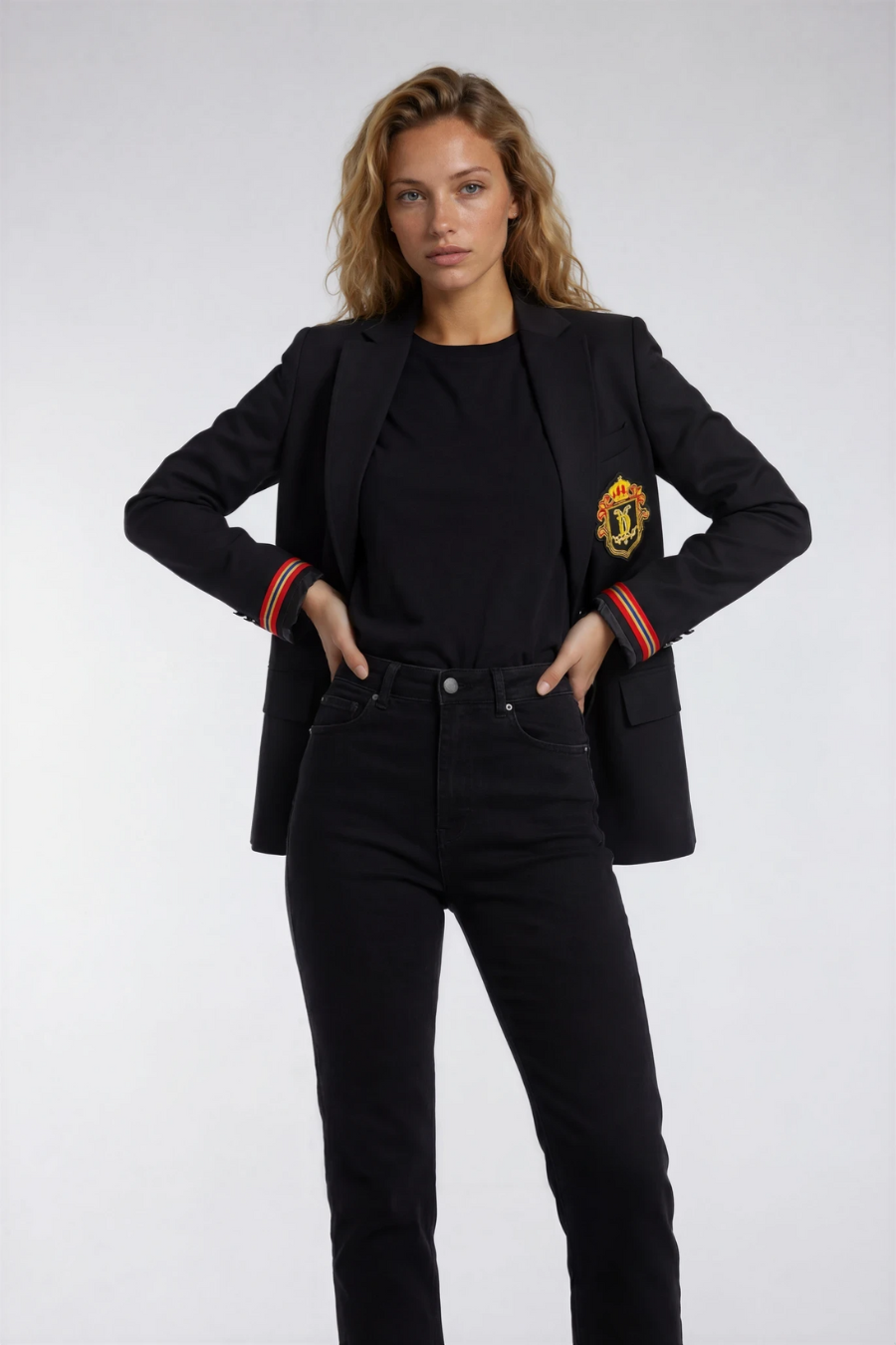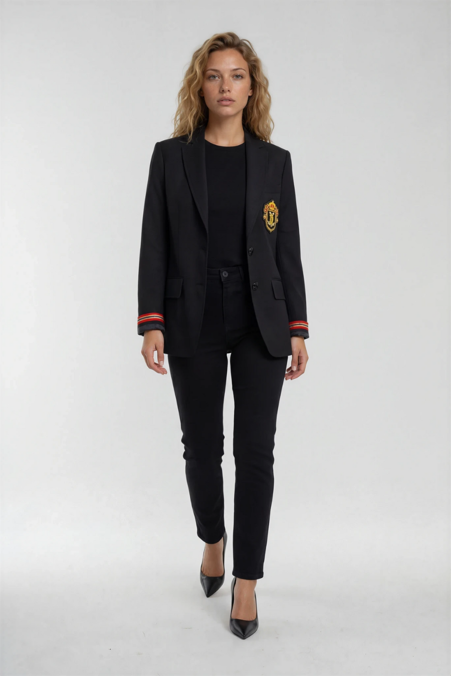 A tailored single-breasted wool blazer with a structured silhouette, removable signature Deval crest, functional front pockets, striped cuff trim, and imprinted buttons for a polished finish.