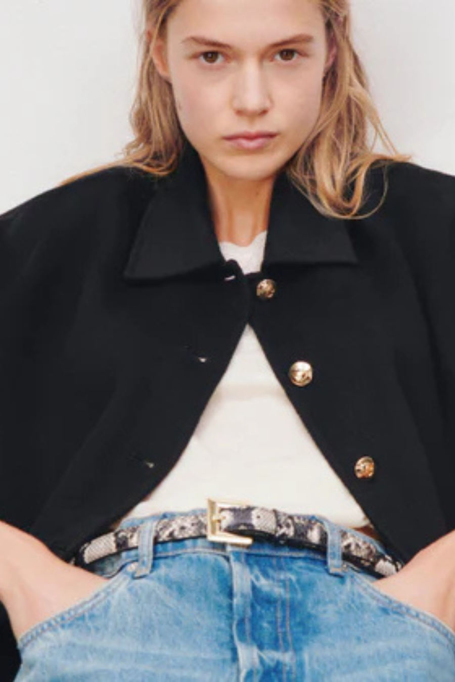 An everyday belt crafted in a black and white snake-skin print with a slightly padded strap. Finished with a square-shaped 14k gold-plated buckle and engraved branding.