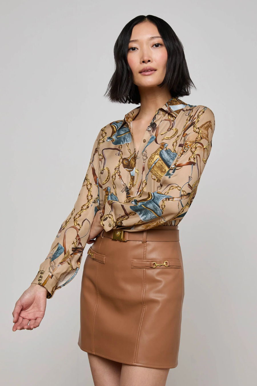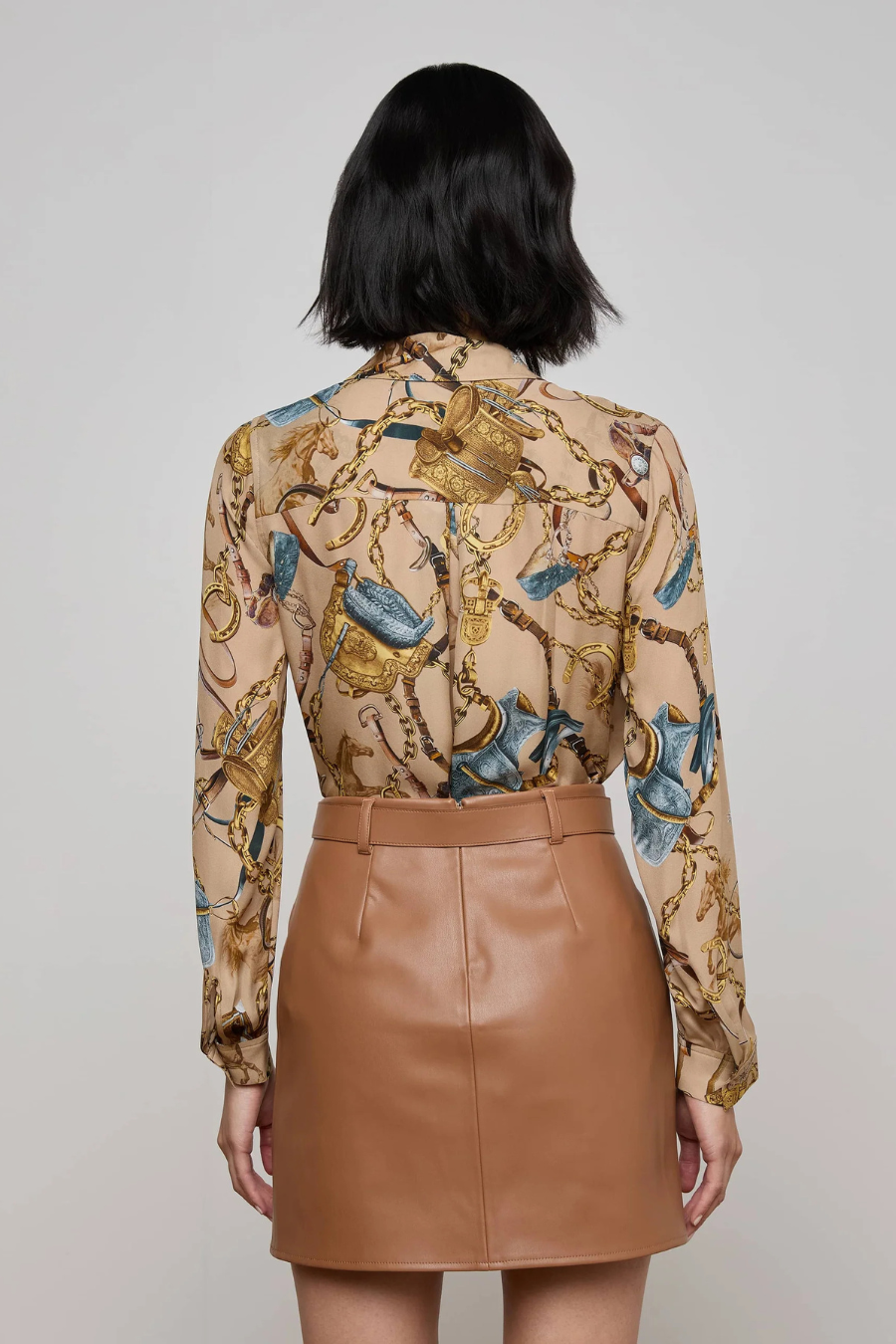 The Nina is our classic long-sleeve silk button-down, designed with an easy, relaxed fit. Now back in a chic equestrian saddle print.