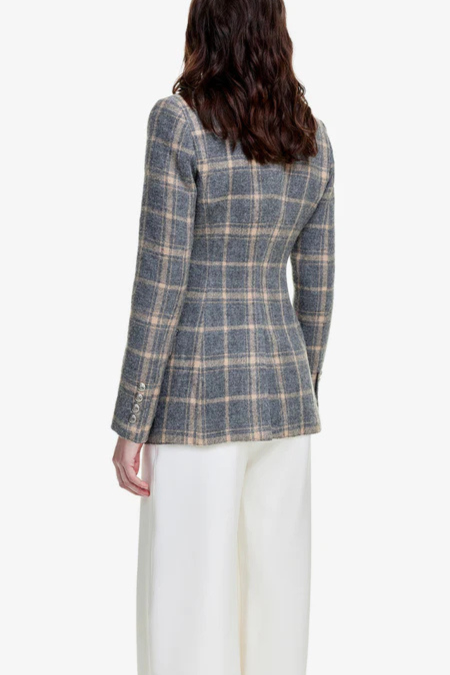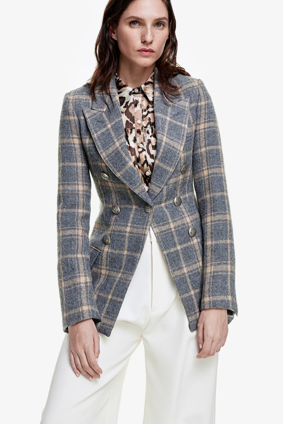 Style Notes: This blazer has all the swagger of a double-breasted blazer but none of the bulk. A lightweight cotton-blend glen check with oversized brass hardware, this sophisticated blazer will take you from patio season right on into fall.