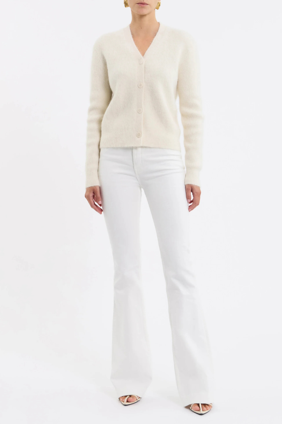 The Novie Knit Cardigan in cream is a timeless wardrobe essential, effortlessly blending comfort with understated elegance. Featuring a flattering V neckline and long sleeves, its relaxed fit enhances the casual-chic aesthetic while ensuring utmost comfort. Self-covered, signature debossed buttons add a refined touch, making this cardigan a versatile layering piece for any elevated wardrobe.