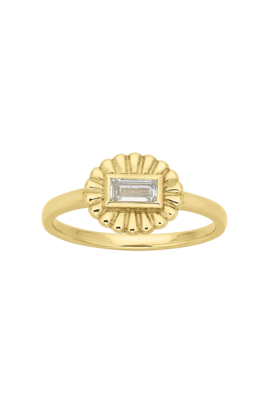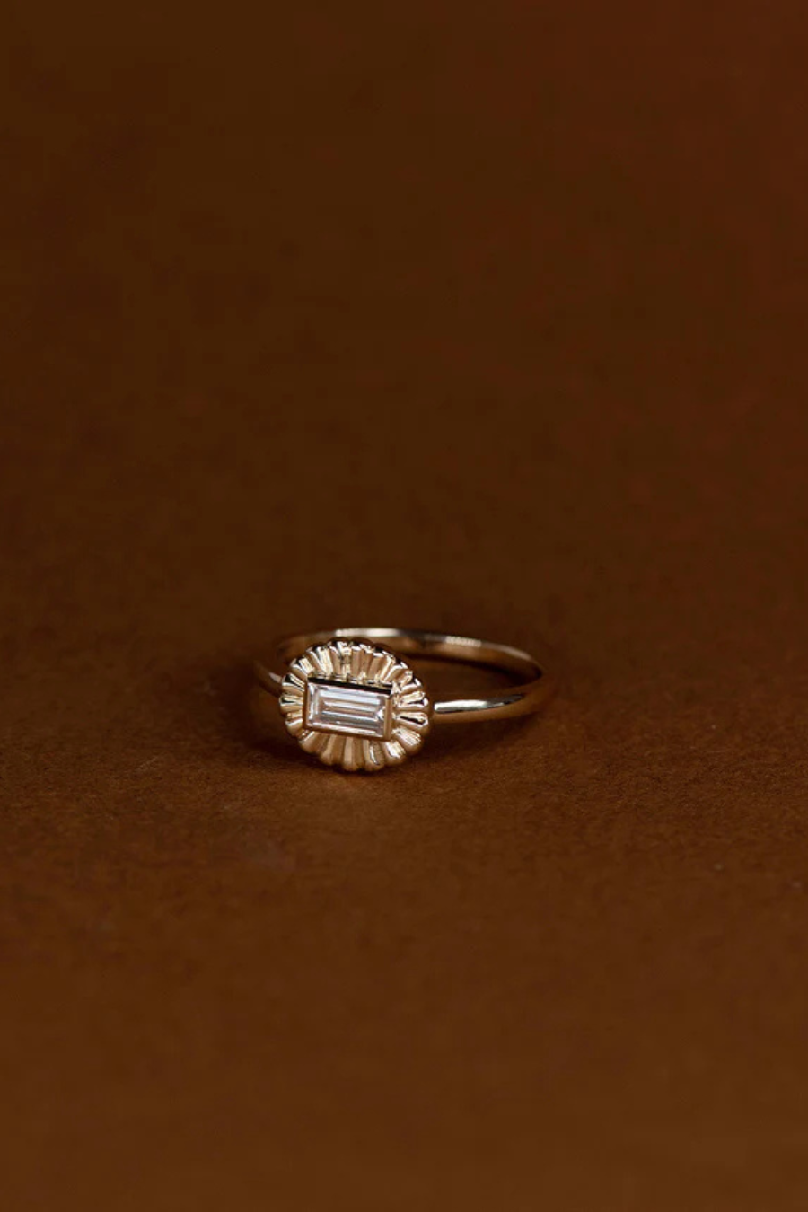 The Odette Ring is inspired by the intricate beauty of vintage jewellery, a piece with timeless details. It features a bezel set, baguette cut White Topaz at its centre, with a contrasting border, designed to highlight the stone's natural shape.