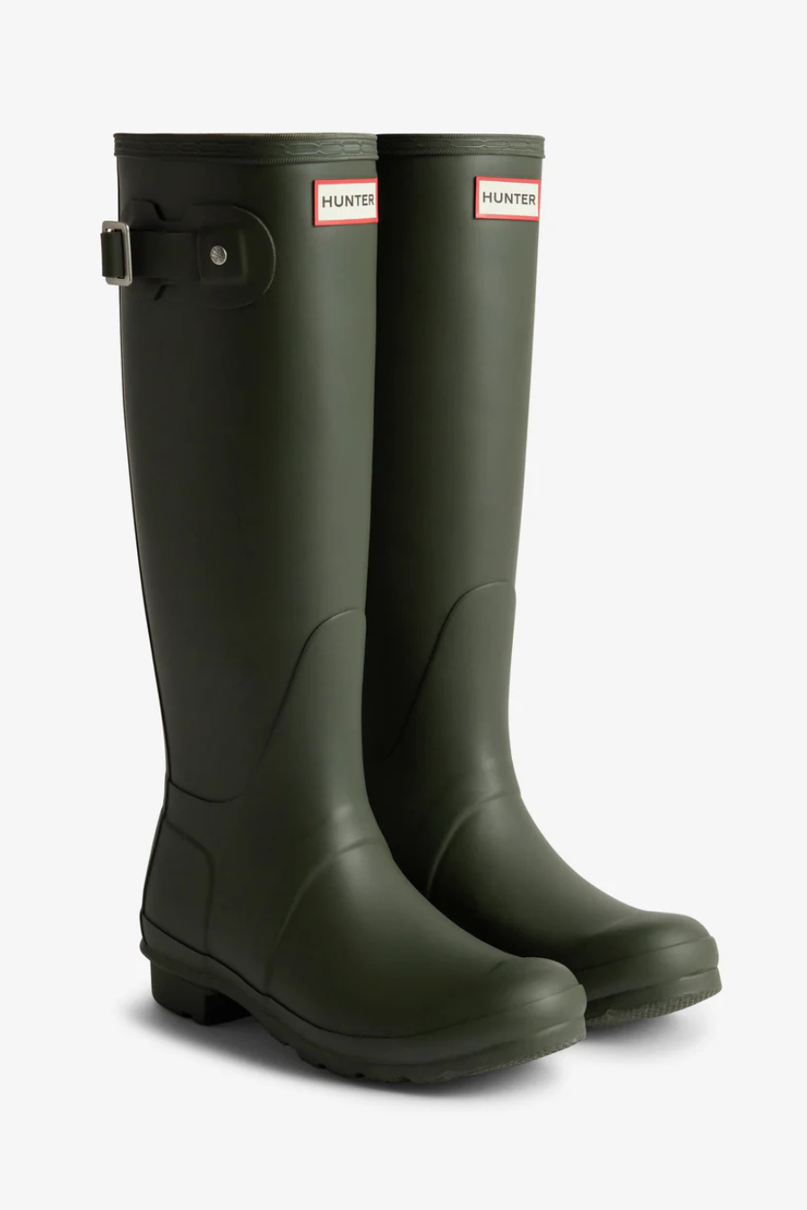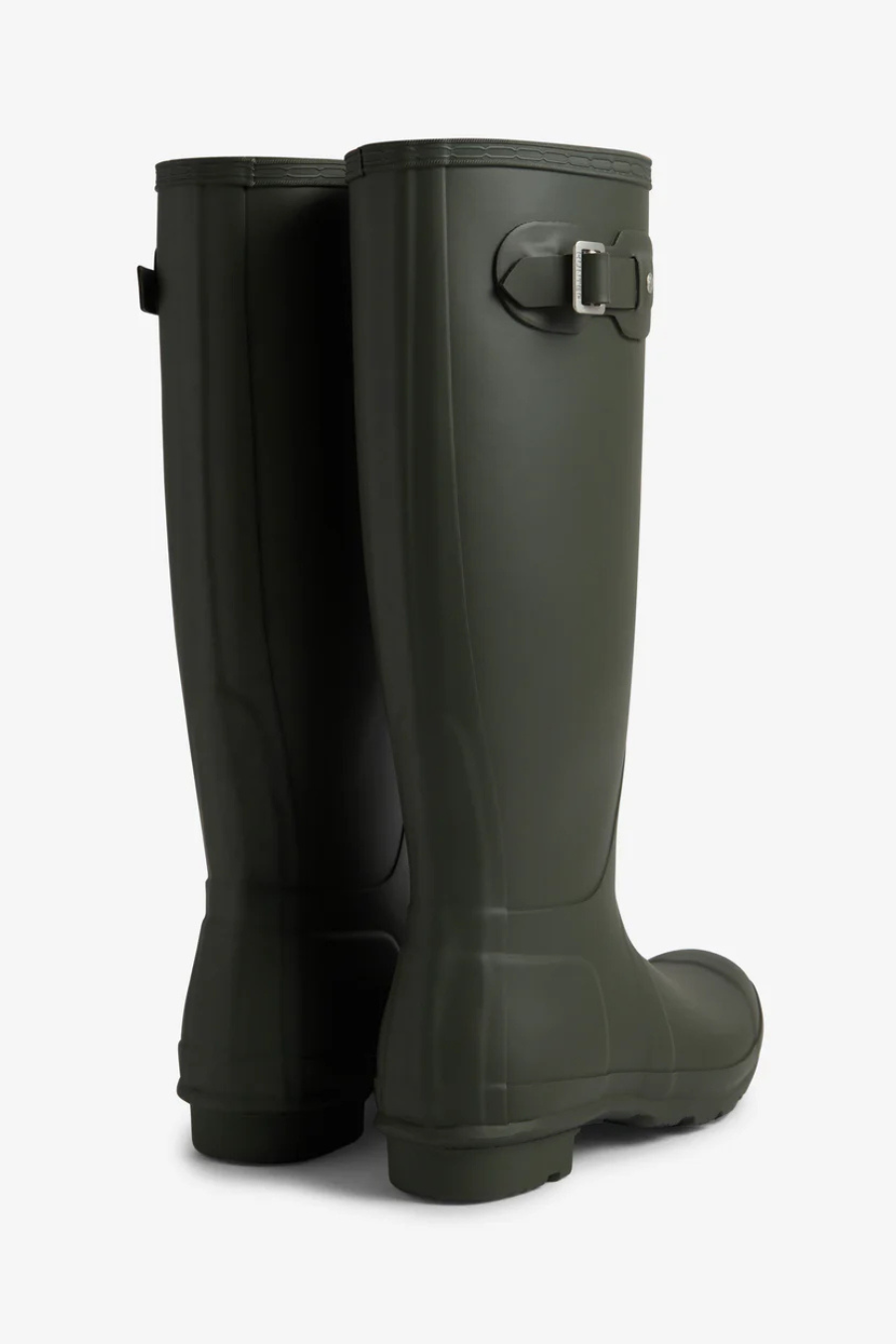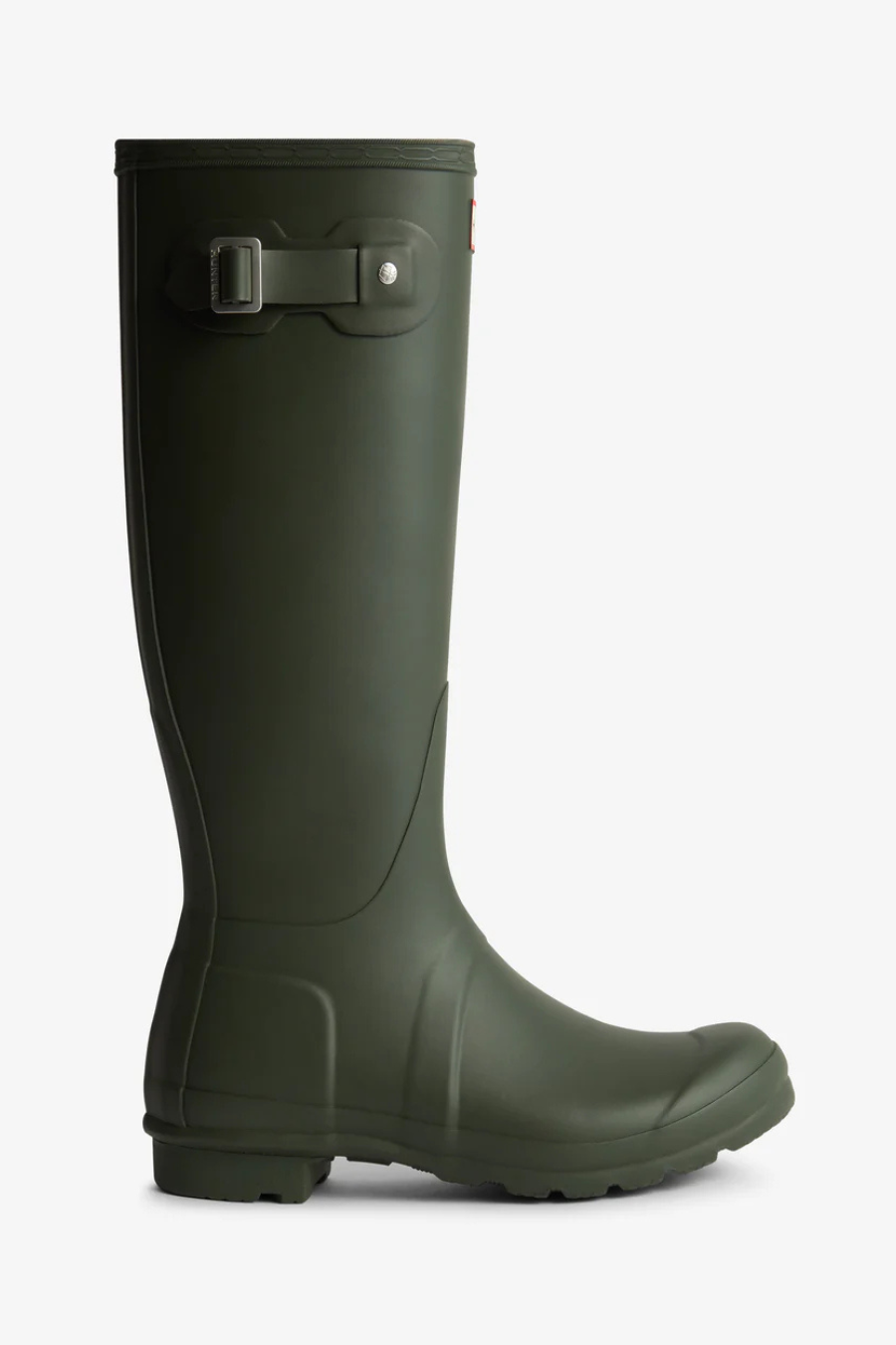 Perfect for wet weather conditions, this women's Wellington Boot has been at the heart of the Hunter Original brand since its introduction in 1956. Formed of natural rubber, each pair is made from 28 hand-cut parts and assembled over three days on an aluminium last bespoke to Hunter, before being vulcanised for superior protection. Featuring the Hunter Original tread pattern, and a comfortable polyester lining, these tall black welly boots are a rainy-day necessity.