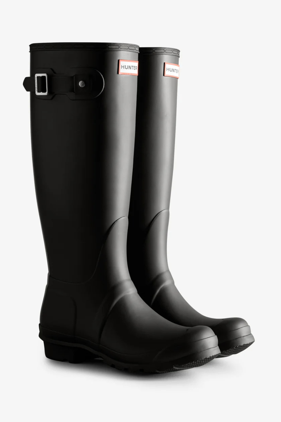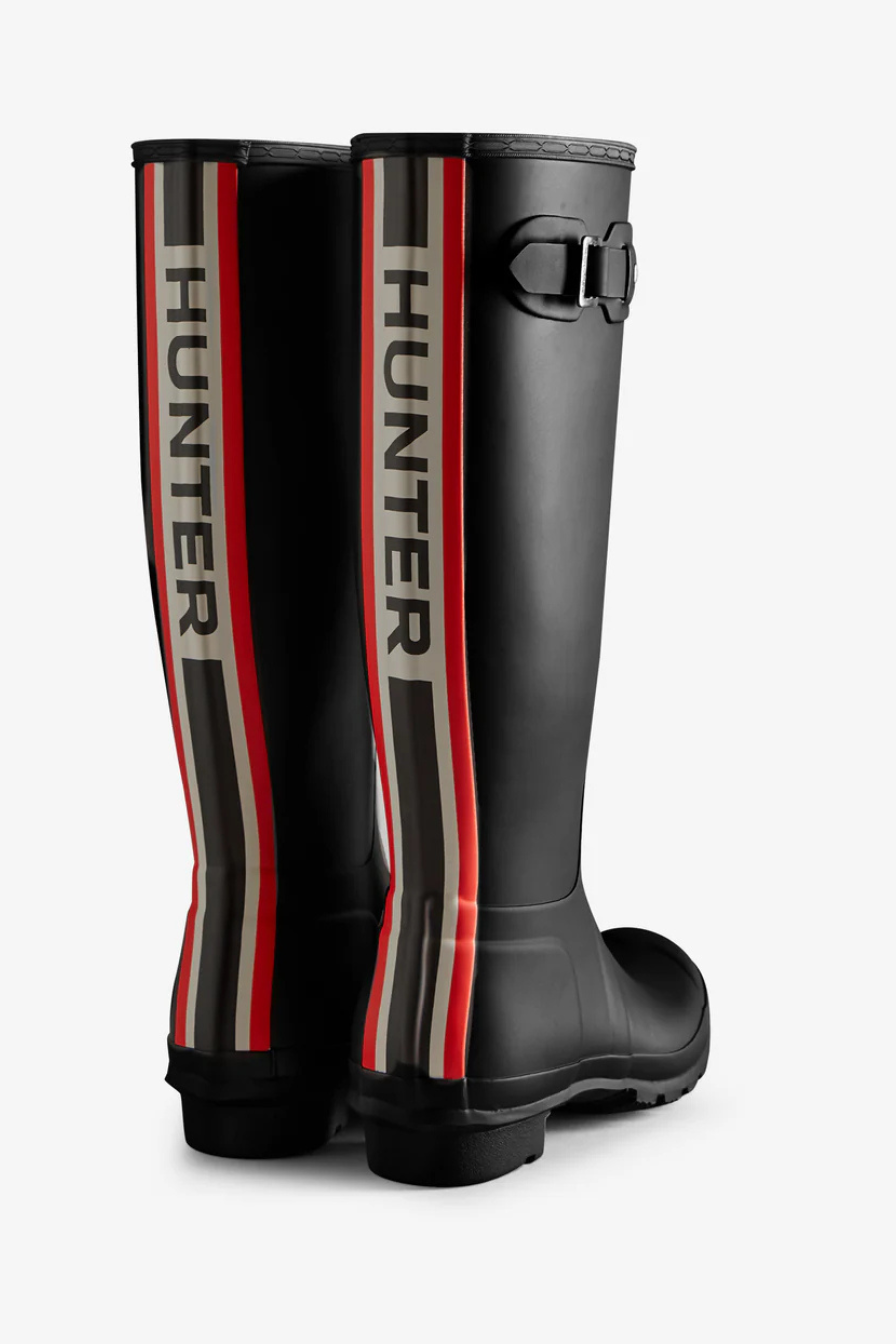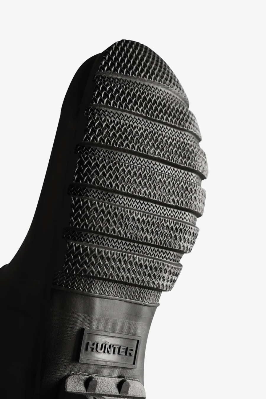 Crafted from FSC®-certified natural rubber from forests independently audited to Forest Stewardship Council® standards. The Hunter Original Tall black Boot has now been updated with the iconic Hunter tri-colour logo on the backstrap. First introduced in 1956, the Original Tall Boot lies at the heart of the Hunter brand. Formed of natural rubber, each pair is handcrafted from 28 parts and assembled over three days on an aluminium last bespoke to Hunter, before being vulcanised for superior protection. The Hunter Original tread pattern and comfortable recycled polyester linings complete the design. We recommend that all Hunter boots be worn with socks to protect the wearer's skin from contact with rubber. All Hunter Boot Socks are specially designed for use with our boot range and feature a fold over top to cover the rubber and nylon boot edge, preventing any rubbing associated with wear.