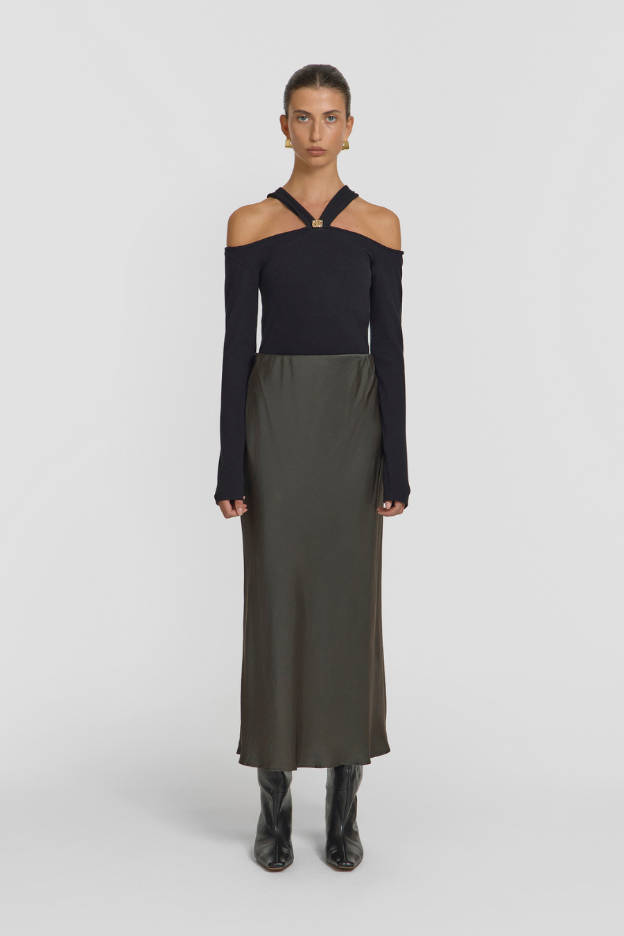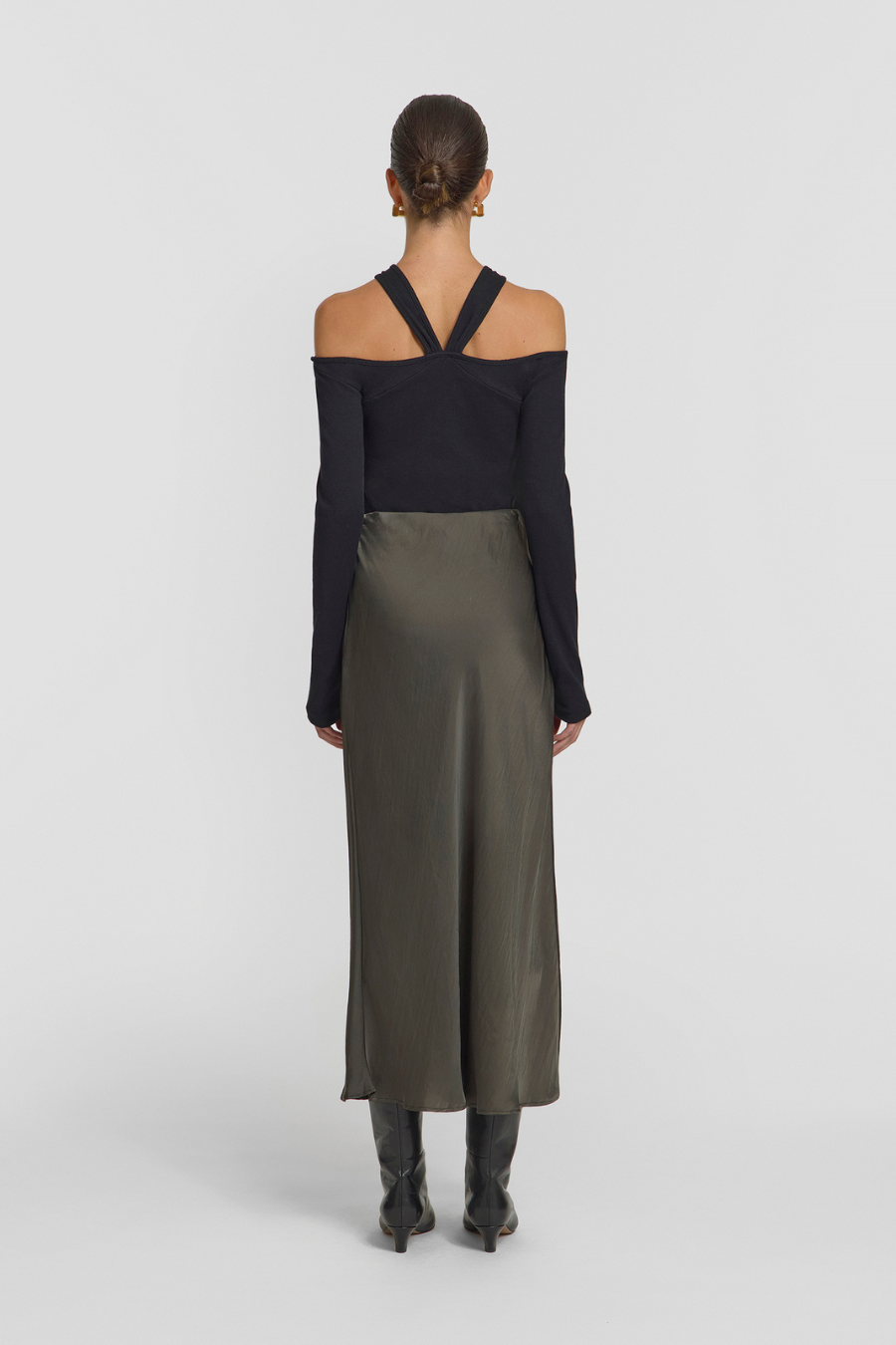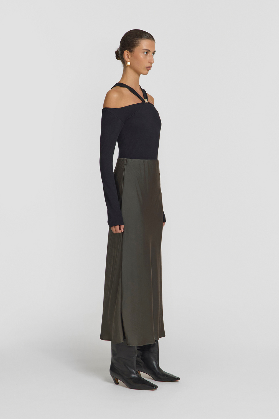 Introducing the Othello Skirt, a sophisticated staple crafted from a cupro blend in a versatile olive green hue. Cut on the bias in a mid-rise, midi-length silhouette, this skirt effortlessly embodies timeless elegance for any occasion. Pair it with this season's olive green offerings for an effortless tonal look, or style it with V&W basics for everyday wear.