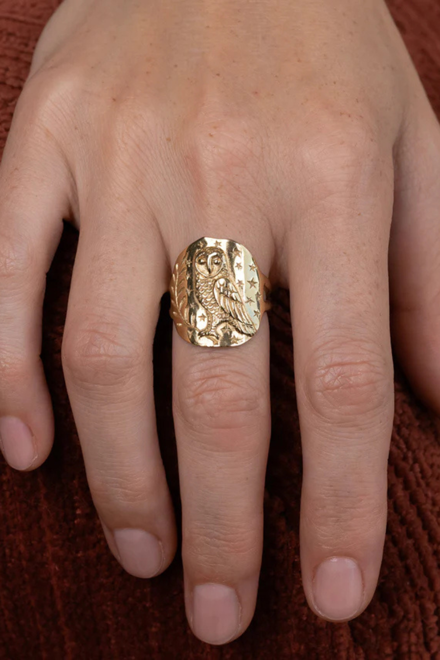 Handcrafted from recycled 925 Sterling Silver and plated in 22k Gold Vermeil, the Owl Ring is designed for impact. Wear it alone to draw attention to its intricate detail, or pair it with multiple rings for a bold, curated look. Ideal as a thoughtful gift for new beginnings, this ring can be worn when seeking courage.