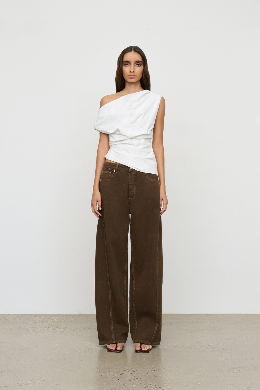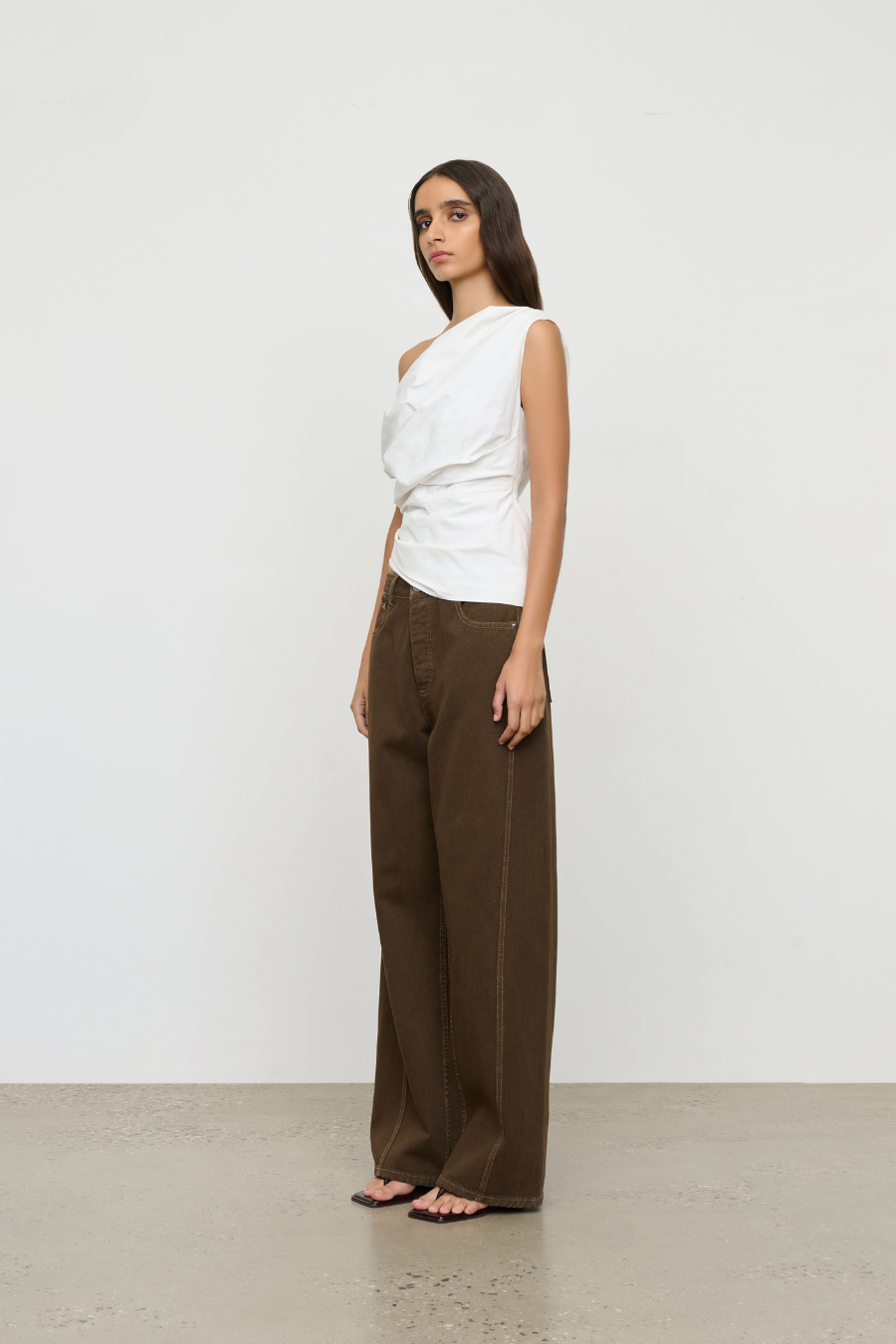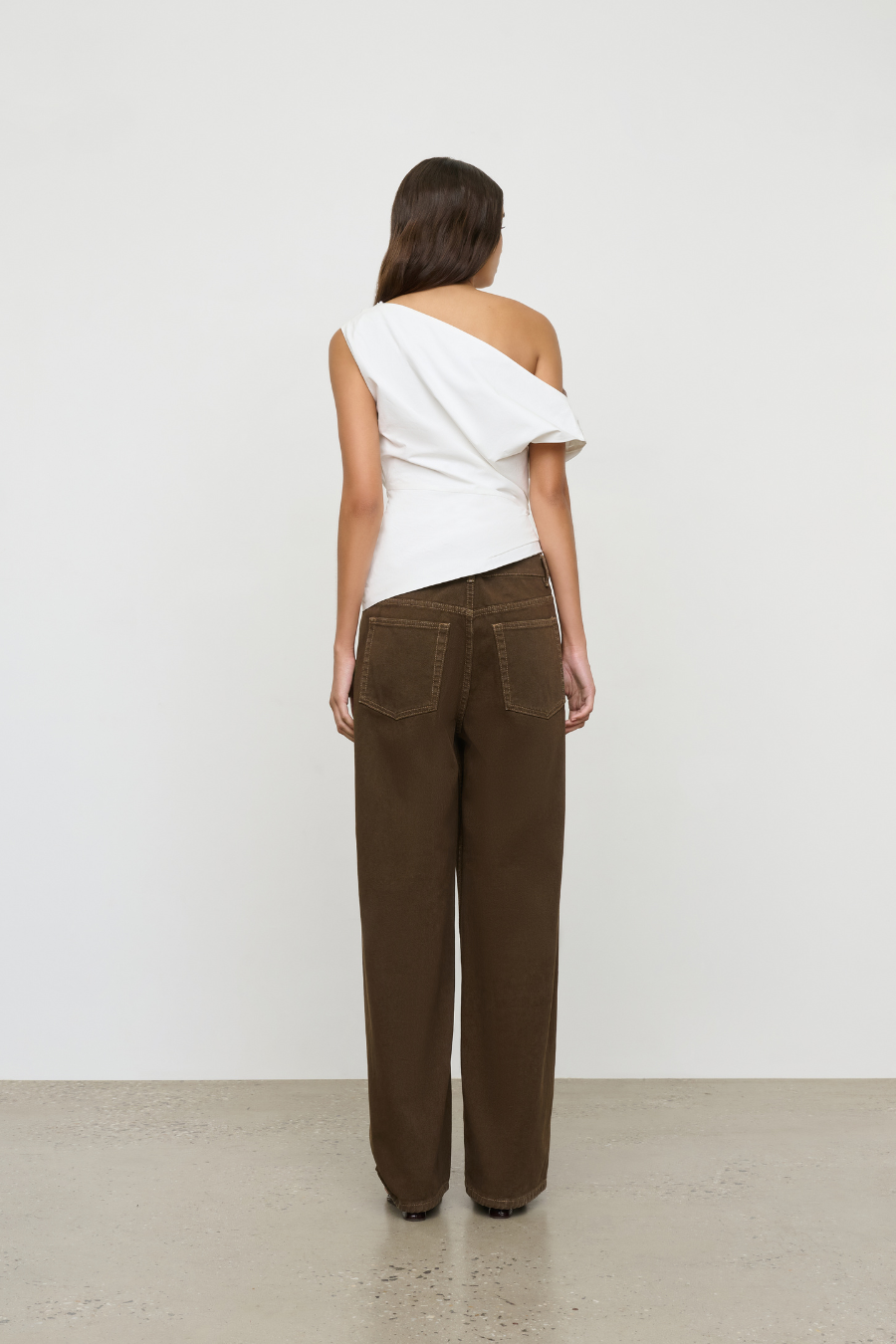 A draped, off shoulder top with tuck detail in a lightweight cotton blend with soft, crisp handle.
