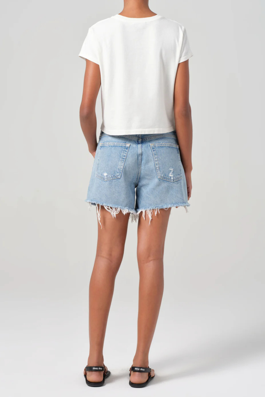 The Parker Long shorts are crafted from bright indigo denim with a vintage-inspired appeal, offering a relaxed high-rise and a comfortable fit through the thighs. Made from regenerative cotton, these shorts are a versatile wardrobe staple—effortlessly pairing with everything from casual tees to more elevated pieces. A true favorite, these shorts combine timeless style with everyday wearability.