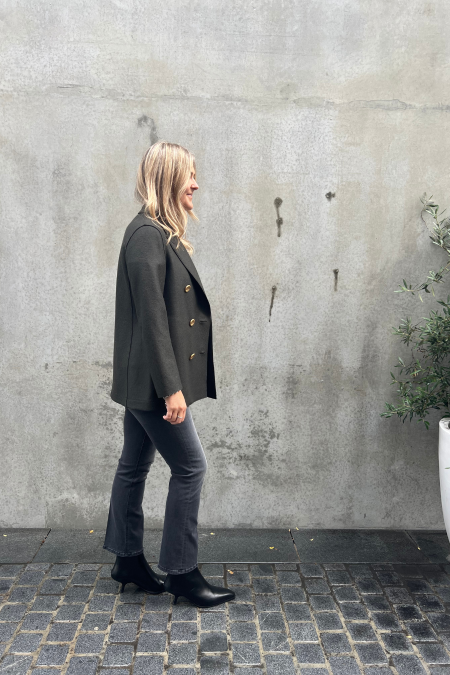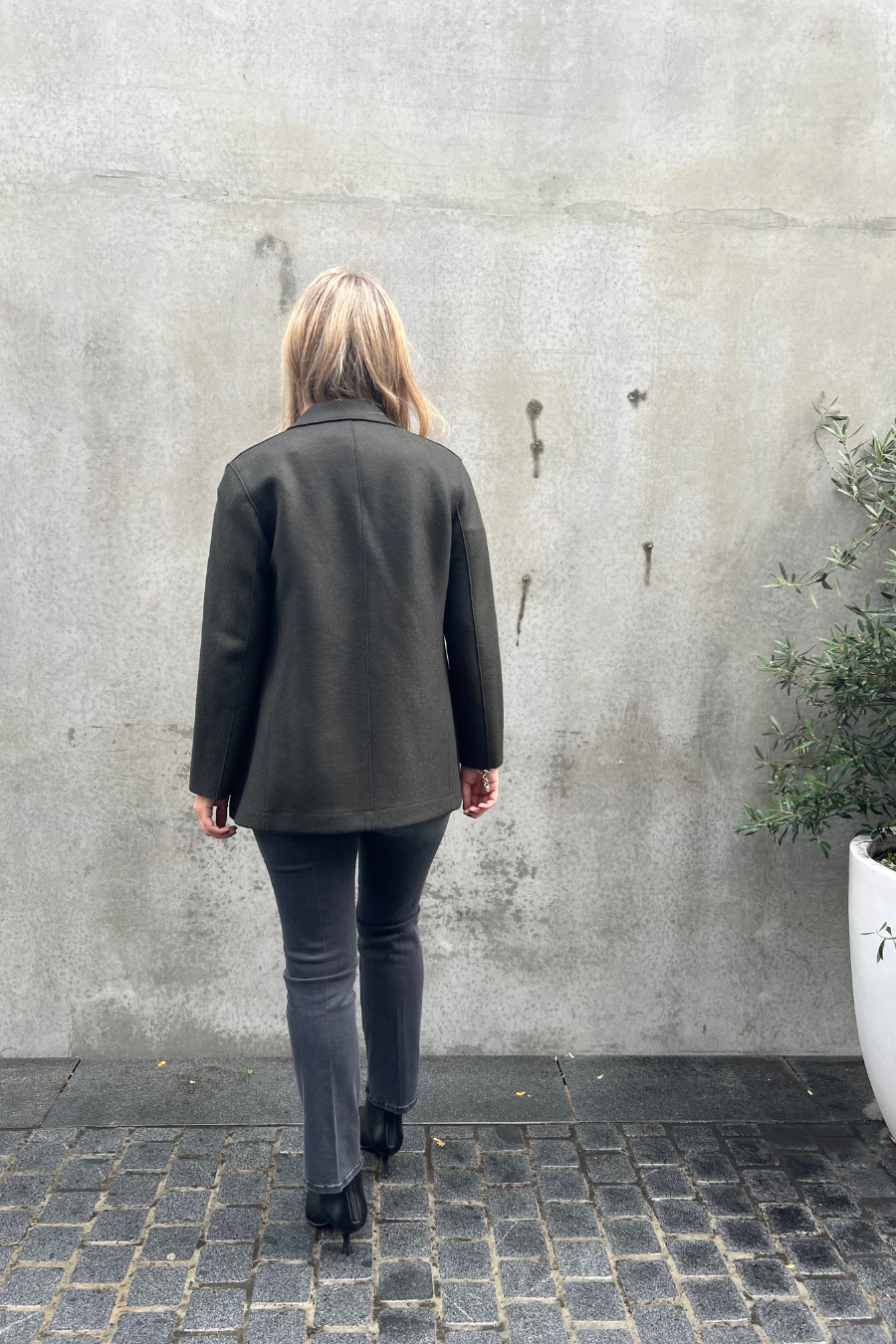 Peacoat, unlined in knitted felted wool. Double-breasted short jacket, A-line shape with fitted long sleeves featuring welt pockets, classic collar shape, wide lapel and 4-button fastening. Raw-edge finish. Made in Italy with Italian fabric.