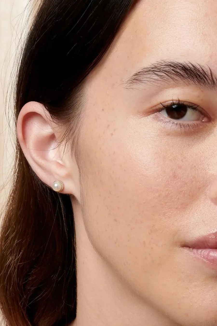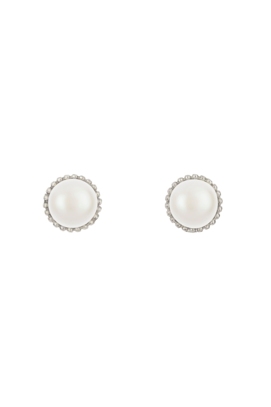The round pearl is encased with a texture contrasting with the smooth face of the pearl.