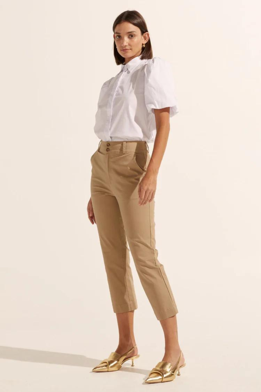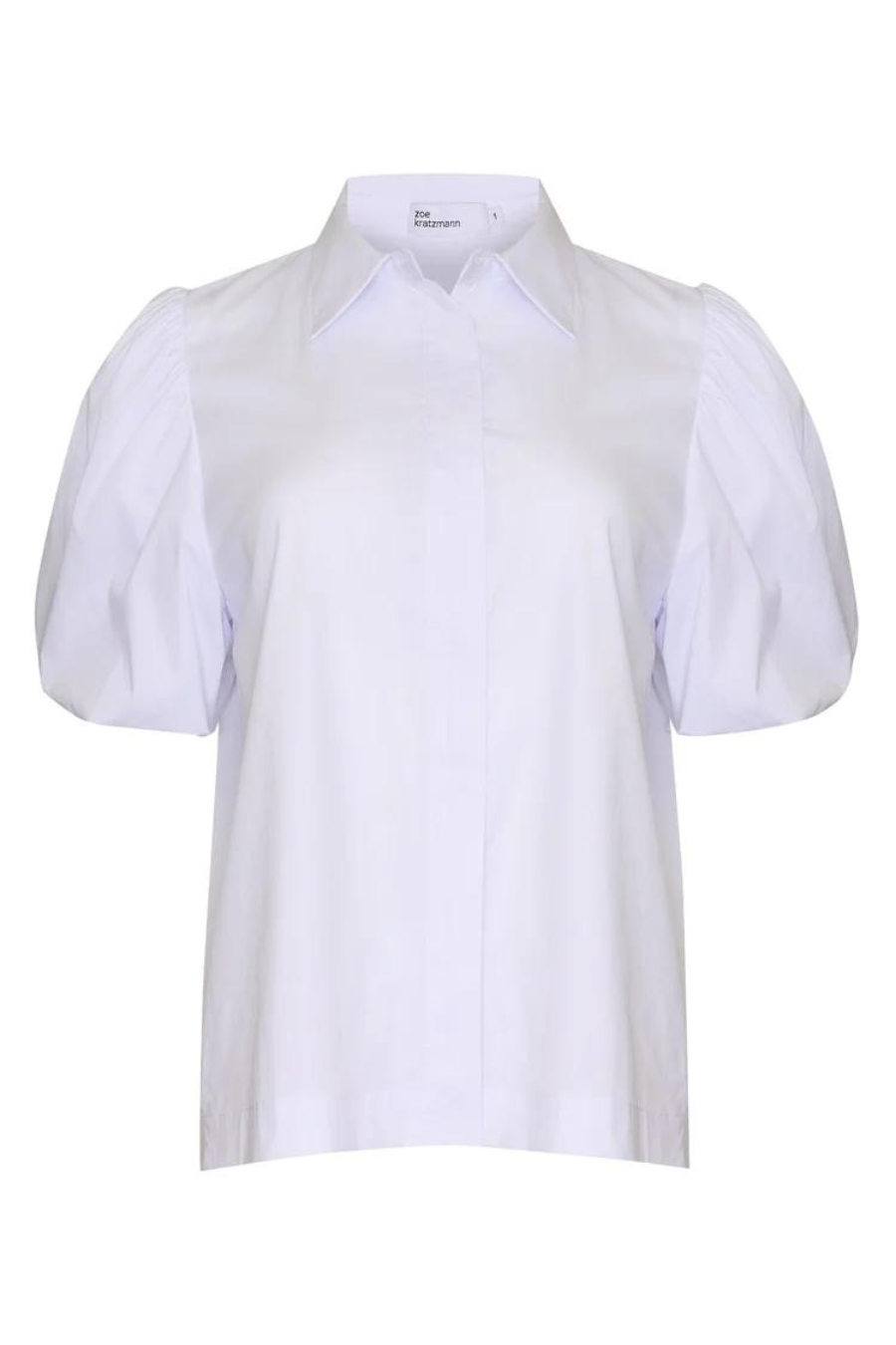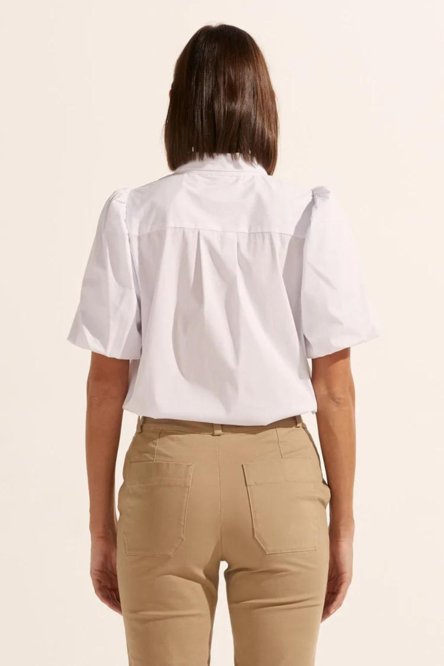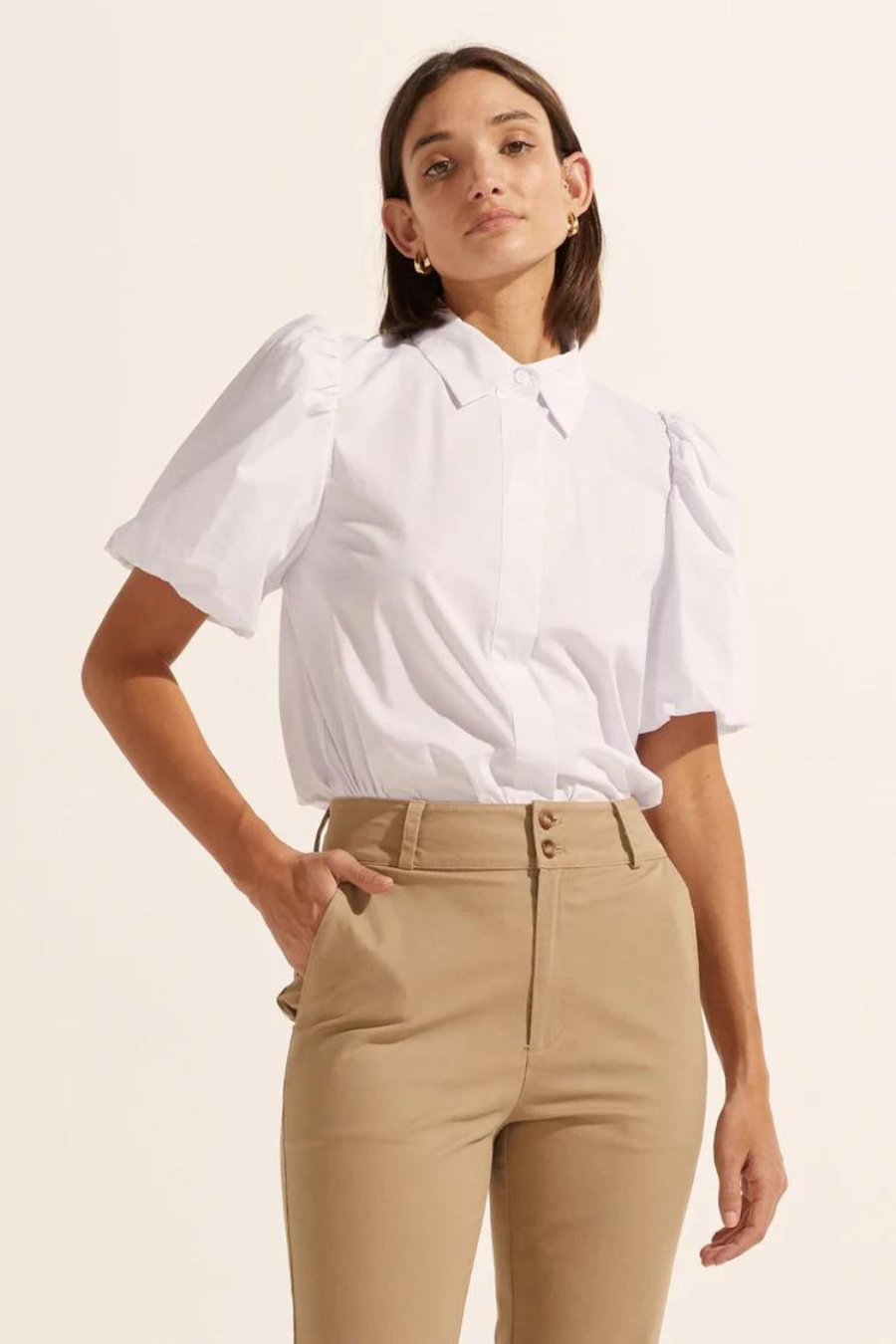 The perch top offers an exacting approach with it's covered button placket, neat collar and short blouson sleeve. It offers a feminine yet refined take on the classic button-down shirt.