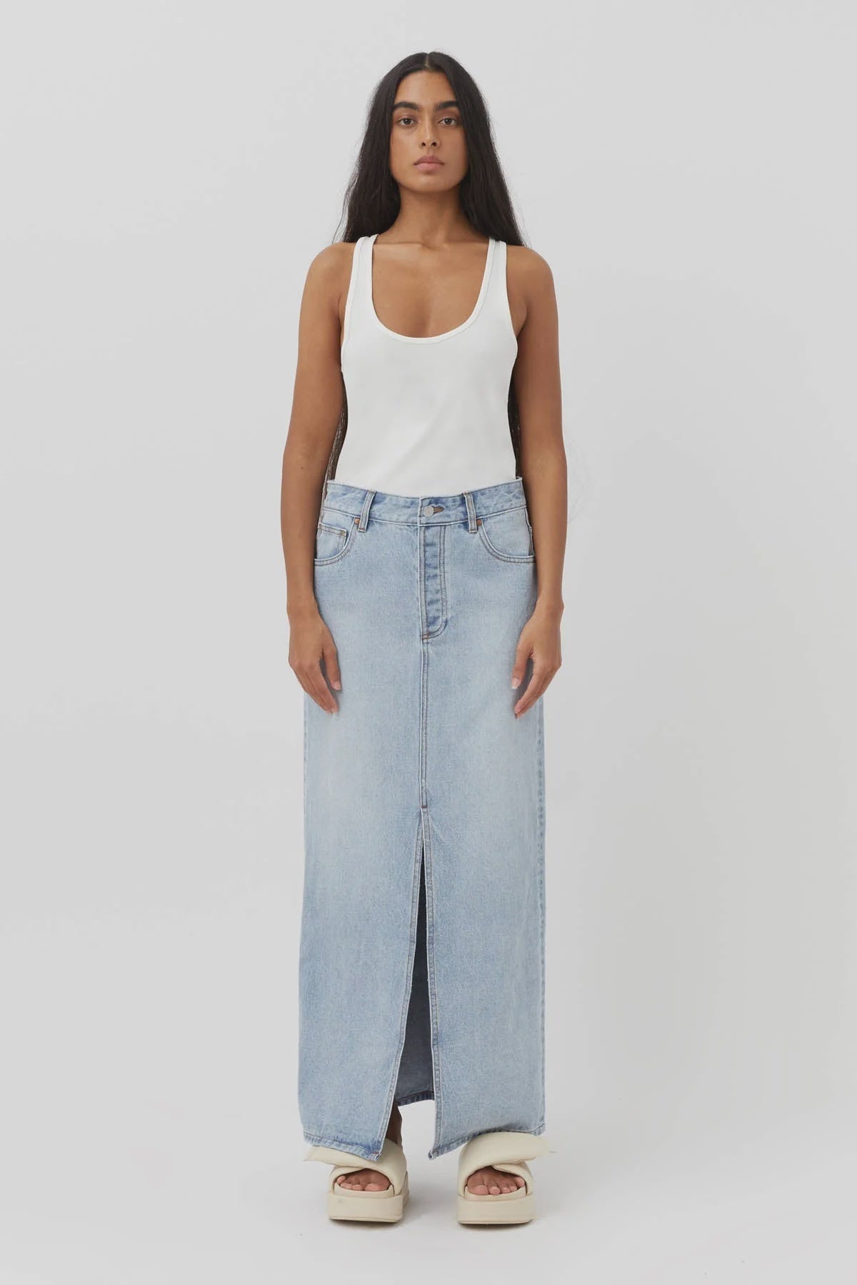 The Phoebe Maxi Skirt is a versatile and timeless piece for your wardrobe. Made from high-quality denim, this skirt offers the perfect balance of comfort and style. The low-waist design adds a modern touch, while the maxi length creates an elegant and sophisticated silhouette. The split at the centre front adds a hint of allure and allows for ease of movement.