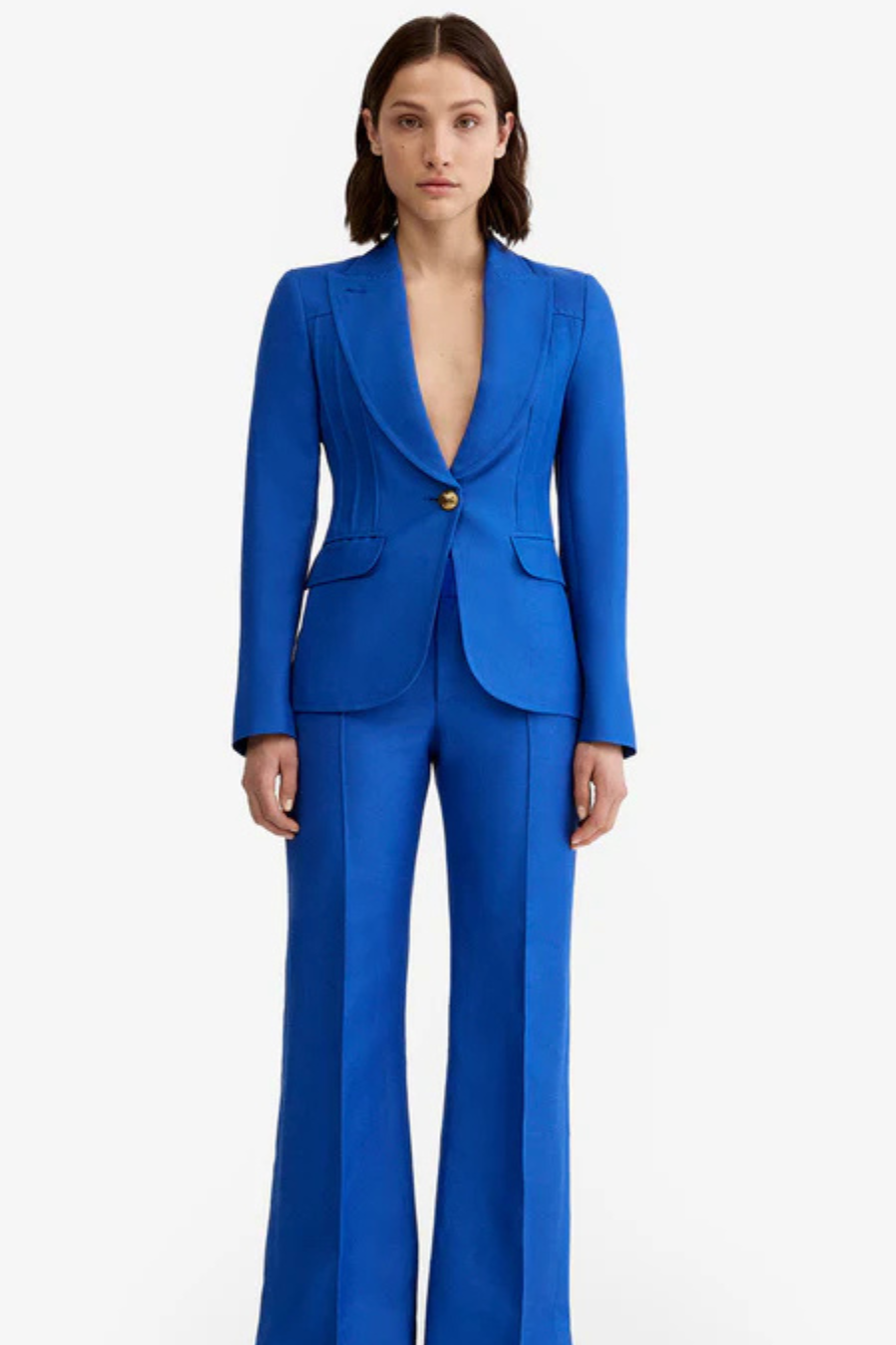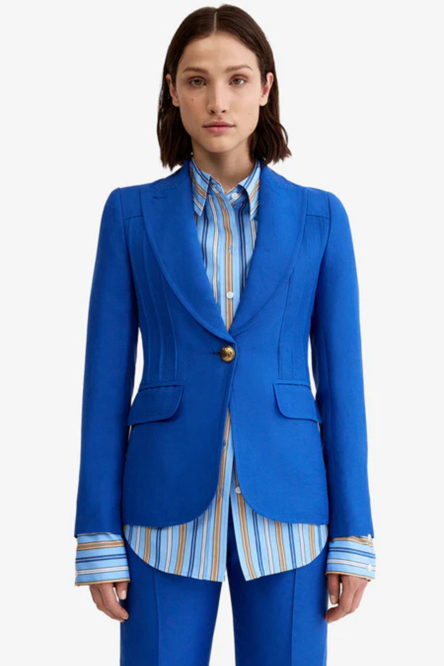 Closely tailored, this peaked lapel blazer silhouette features flattering pintucking and signature brass buttons.