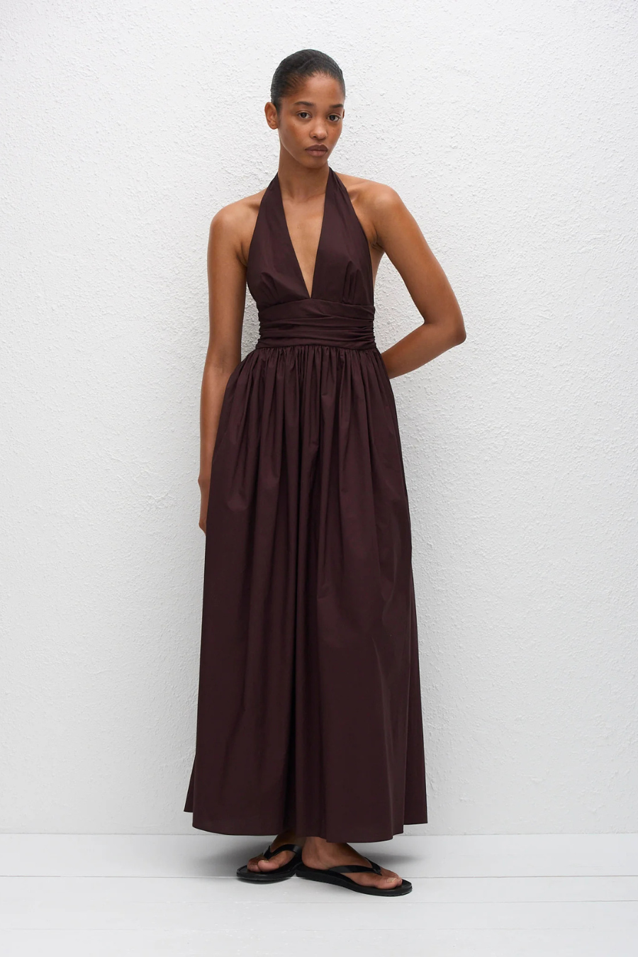 Introducing the Plunge Halter Dress made from our Organic Cotton. Featuring a fitted bodice, an elongated neck tie and a low back. Wear with strappy sandals for a refined, polished look.