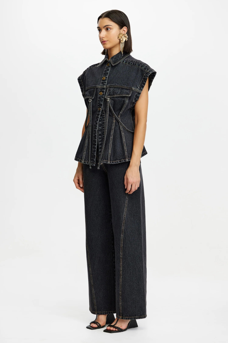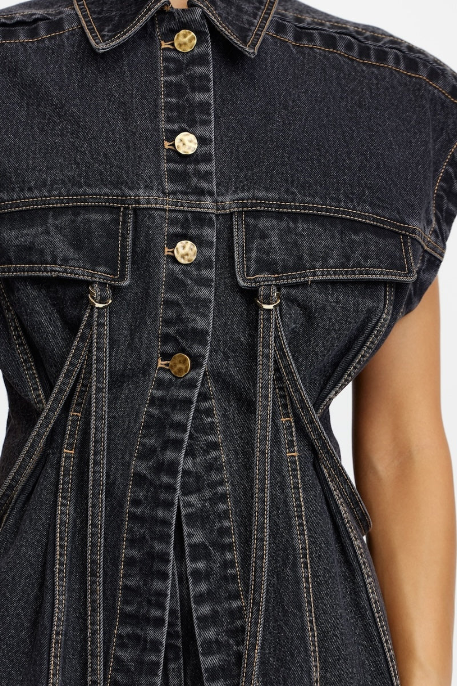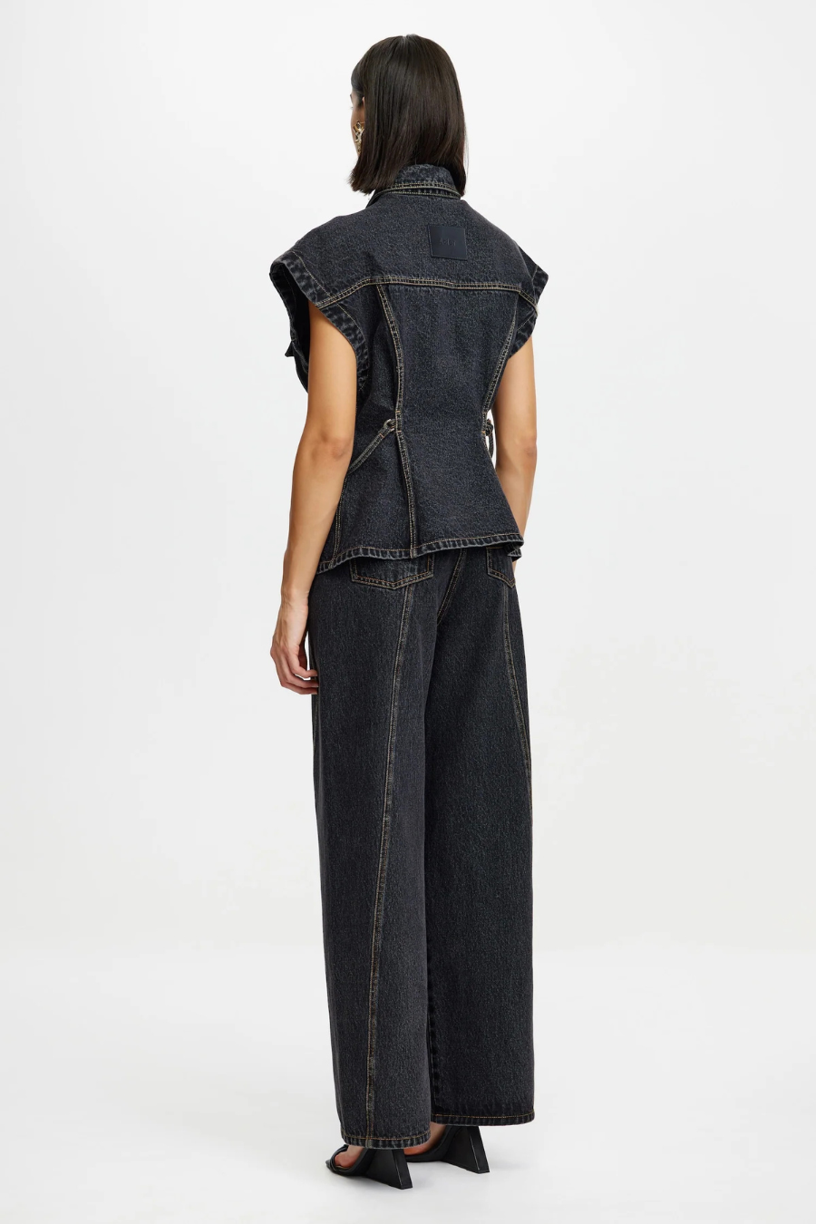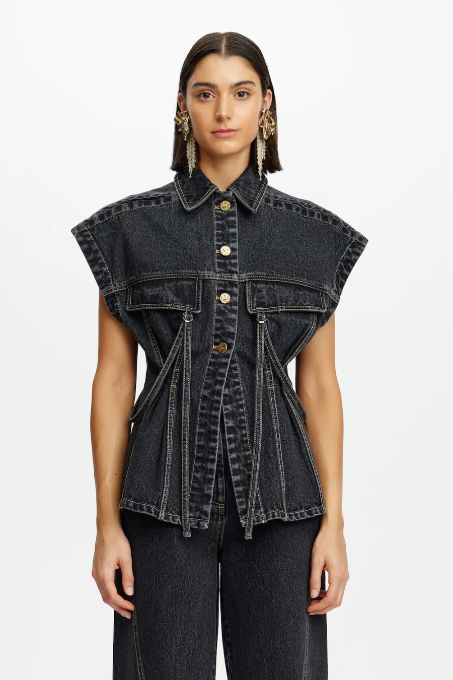 A bold take on classic denim tailoring, the Poulton Top in Black is designed to sculpt the waist while amplifying structure. Featuring wide shoulders, contrast topstitching, and a functional tie detail, this sleeveless silhouette is finished with a button front closure for a polished edge.