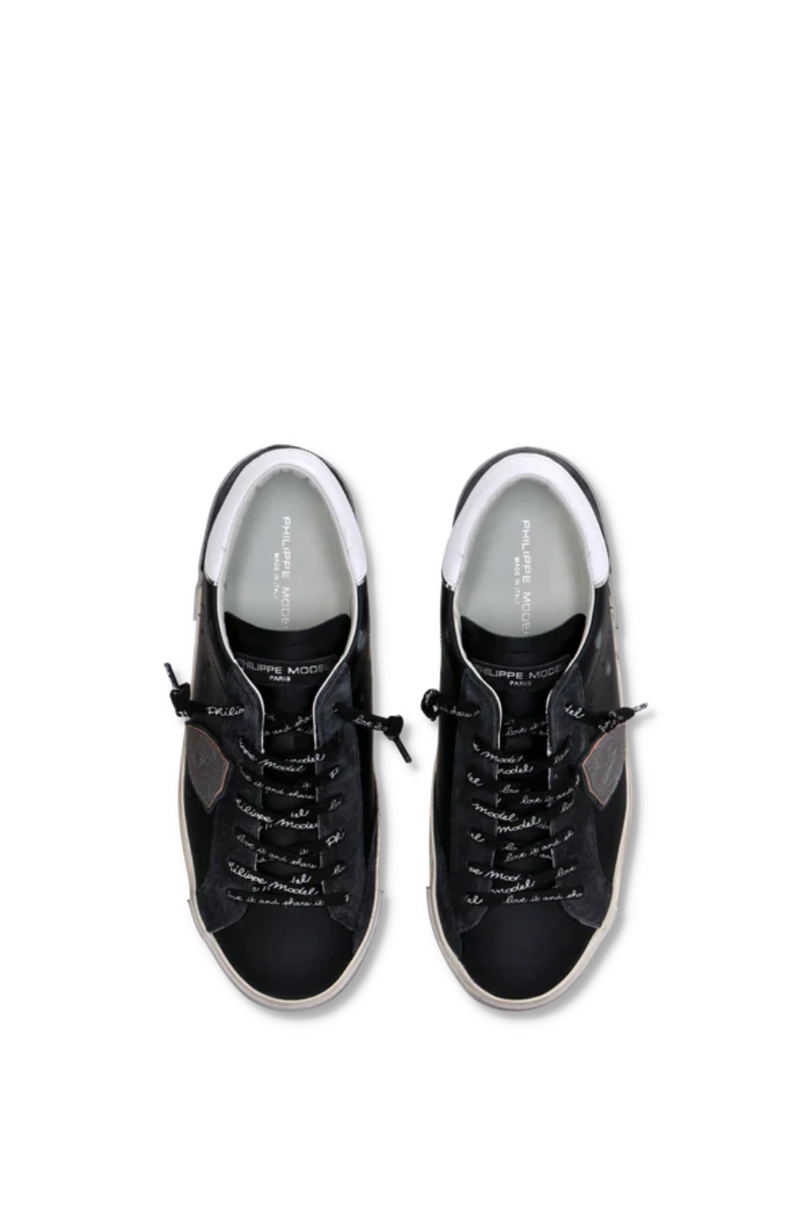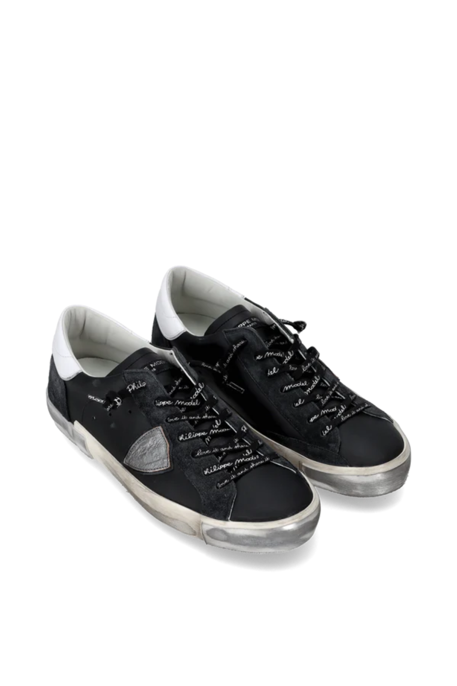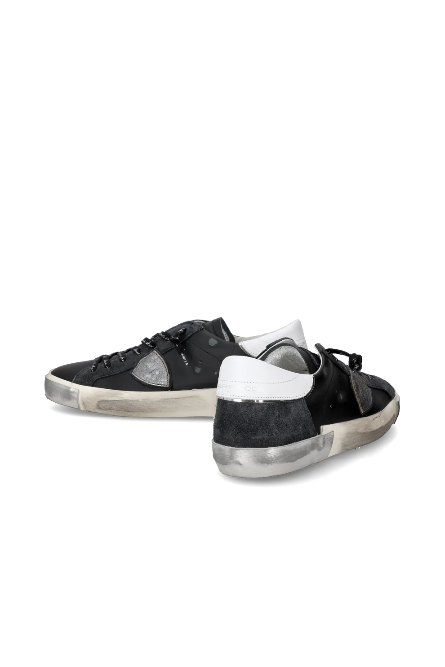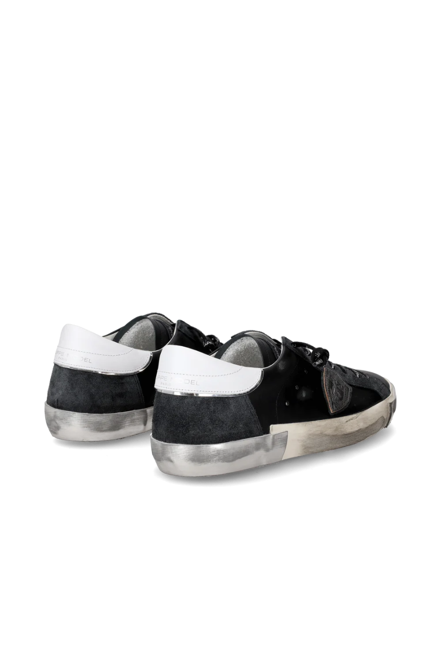 Chromatic minimalism in black and white for this timeless version of the Prsx sneaker. The shapes are inspired by 80s street models, recreated in a contemporary and fashionable style. The calfskin and suede upper is complemented by a contrasting heel tab and a mirror-effect trim, with a worn finish for an original look. The asymmetrical side band is handcrafted and brushed for a worn effect.
