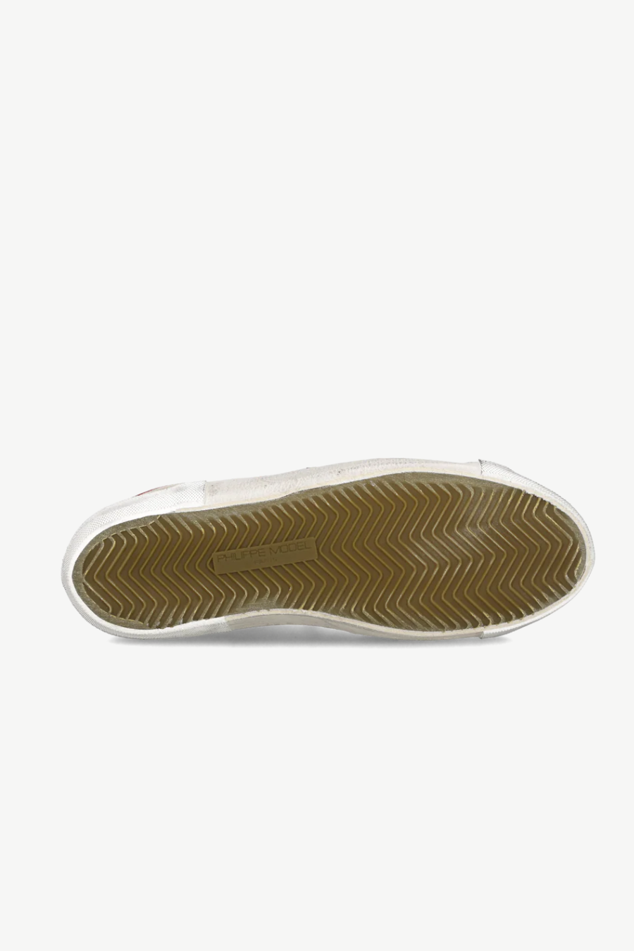 The cool, urban materiality of tennis ball felt meets the energy of Prsx sneakers, with a design inspired by ‘80s street models revamped with trendy finishes and details. The heel tab is made of red leather and echoes details such as the underside of the shield and the side logo. The shield is in suede, contrasting with the rubber sole, featuring a handcrafted band with markings for a worn look.