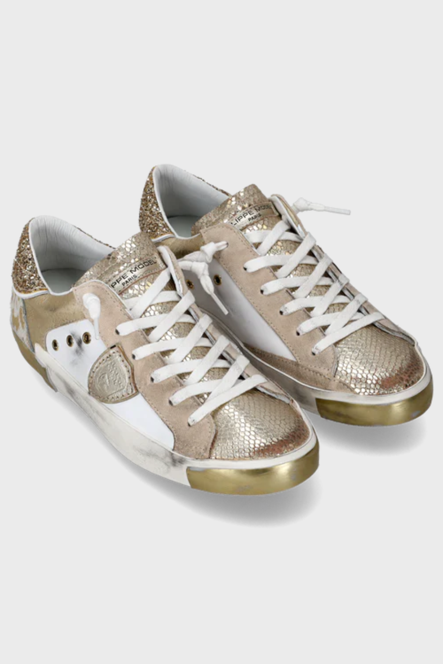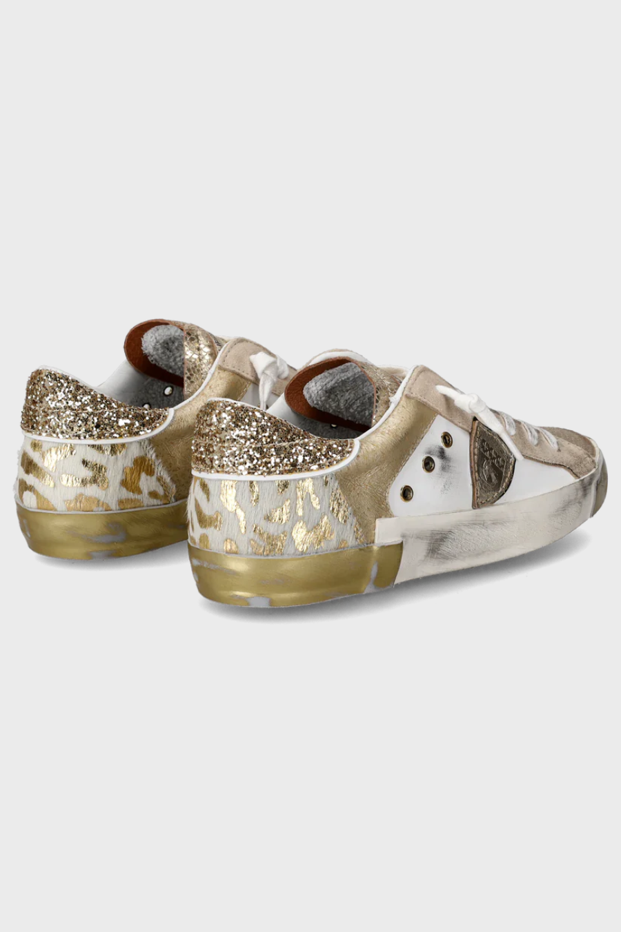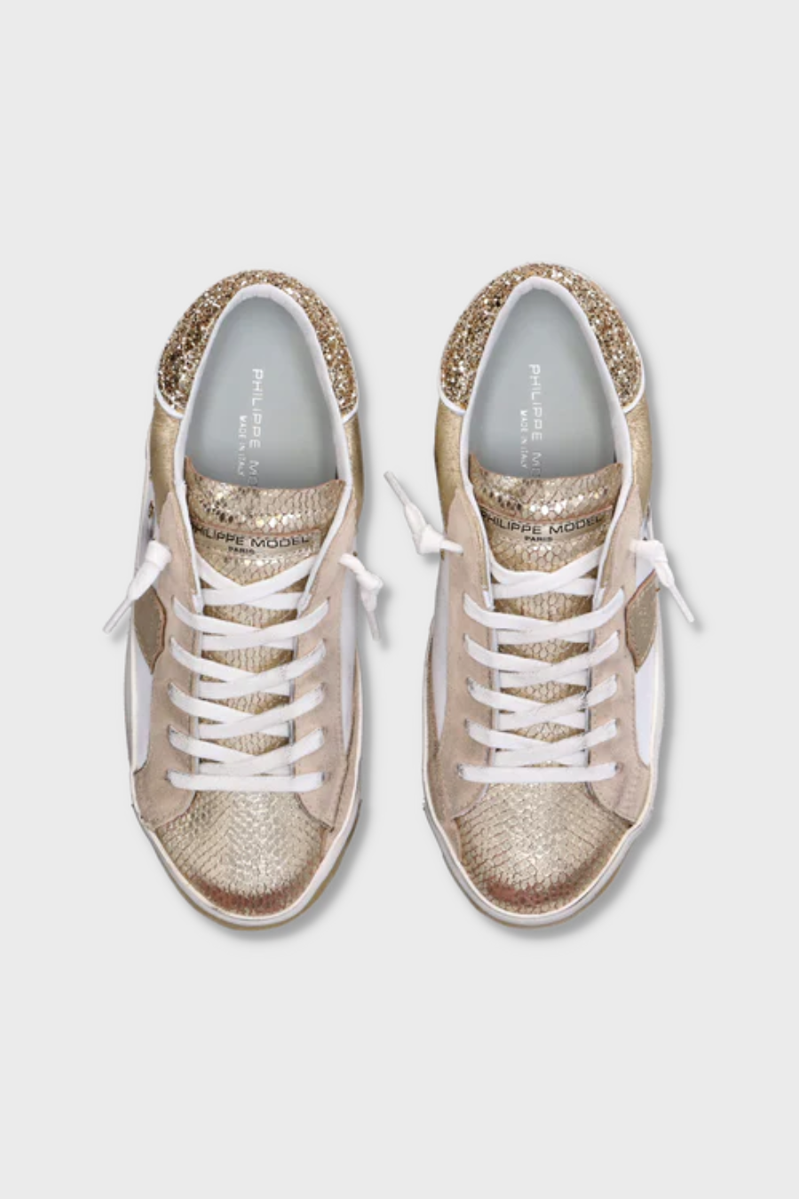Golden hour all day long with the new Prsx by Philippe Model. The design inspired by ‘80s skate shoes comes in a sparkling mix of materials. It features laminated suede with reptile pattern on the toe and tongue, metallic animal-print details on the heel, glitter on the heel tab, and calfskin and suede with markings on the sides. The result is decisively cool, complemented by a handcrafted band with markings on the sole and gold touches on the toe and heel.