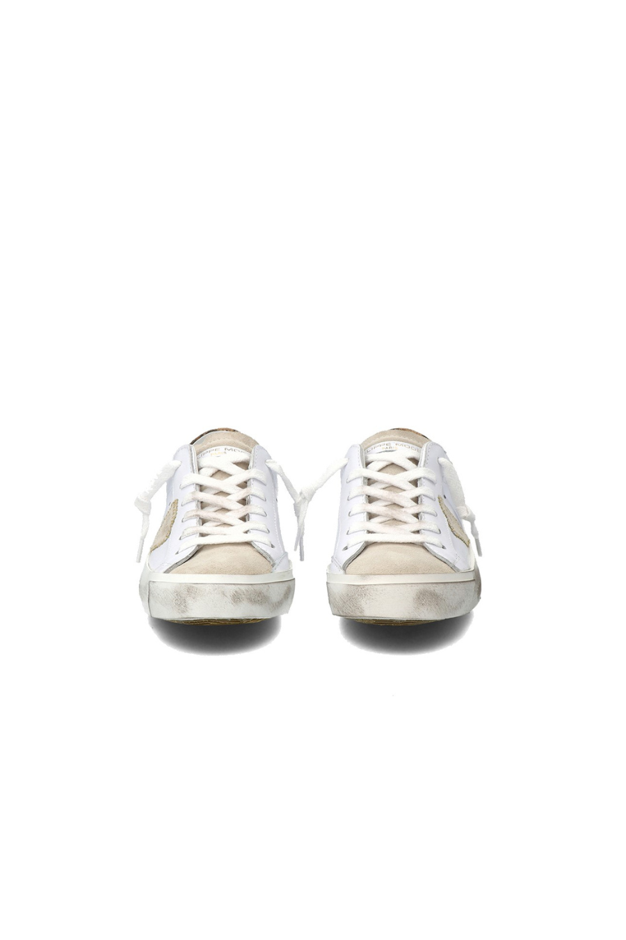 The idea of ‘lived-in’ as a synonym for craftsmanship can be seen clearly in the Philippe Model PRSX, thanks to unique, patented foxing tape that creates a purposefully imperfect sole. The shield on the side of the shoe features the coat of arms of the City of Paris, where Philippe Model launched its brand. The upper is made from calfskin, with mirrored fabric, snakeskin print calfskin and laminated leather inserts. The laces are silver with a lurex thread. The sole, 2.5 cm high, is made from vintage effect brushed rubber. Philippe Model Paris uses Italian materials and leather. We call it ‘made with care in Italy’.